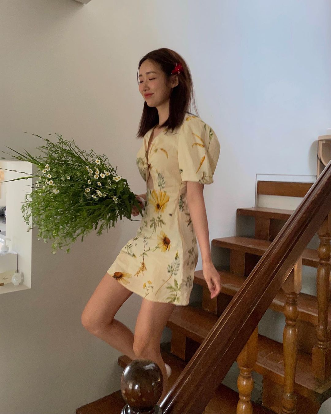 입기만 하면 품절 대란을 일으키는 차정원이 선택한 스파브랜드 제품은 바로 H&M 컨셔스 컬렉션. 차정원은 야생화를 핸드 페인팅 수채화로 재현한 H&M 컬렉션 드레스를 착용해 사랑스러운 데일리 룩을 완성했다. 러블리한 플로럴 패턴도 매력적이지만 세련된 컷 아웃 디테일이 이 드레스의 가장 큰 특징. 혹 컷 아웃 디테일이 부담스럽다면 슬리브리스 톱을 함께 매치해 스타일링하는 방법도 참고할 것.