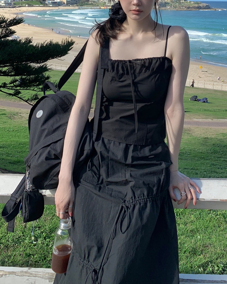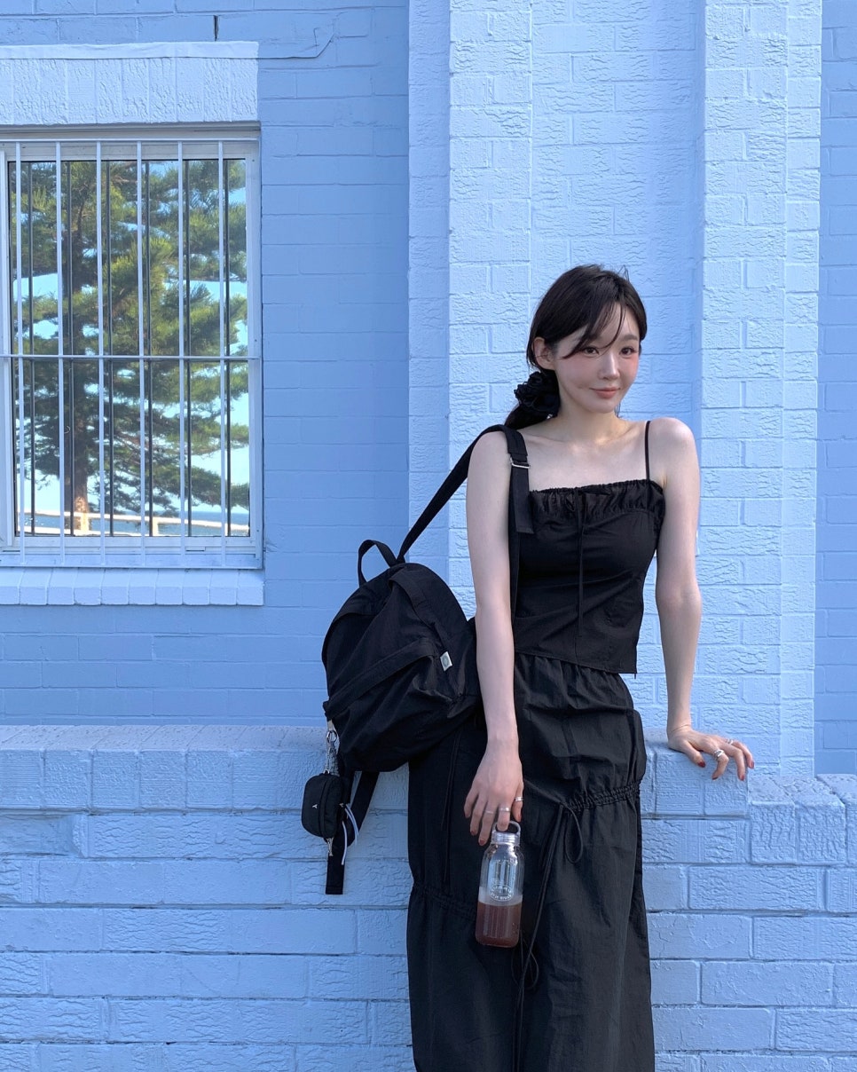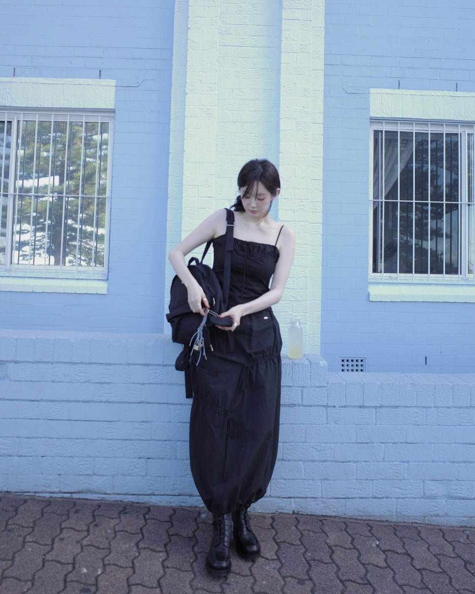 아비에무아는 강민경이 얼짱 시절부터 쌓아왔던 탄탄한 감각과 스타일리시함을 바탕으로 론칭한 브랜드예요! 그래서인지 미니멀한 감성을 추구하는 이들로부터 많은 사랑을 받고 있는데요. 최근 강민경은 깔끔하면서도 세련된 무드가 돋보이는 러플 디테일의 맥시 원피스에 블랙 컬러 미니 백팩을 매치해 사랑스러우면서도 편안한 룩을 선보였어요.