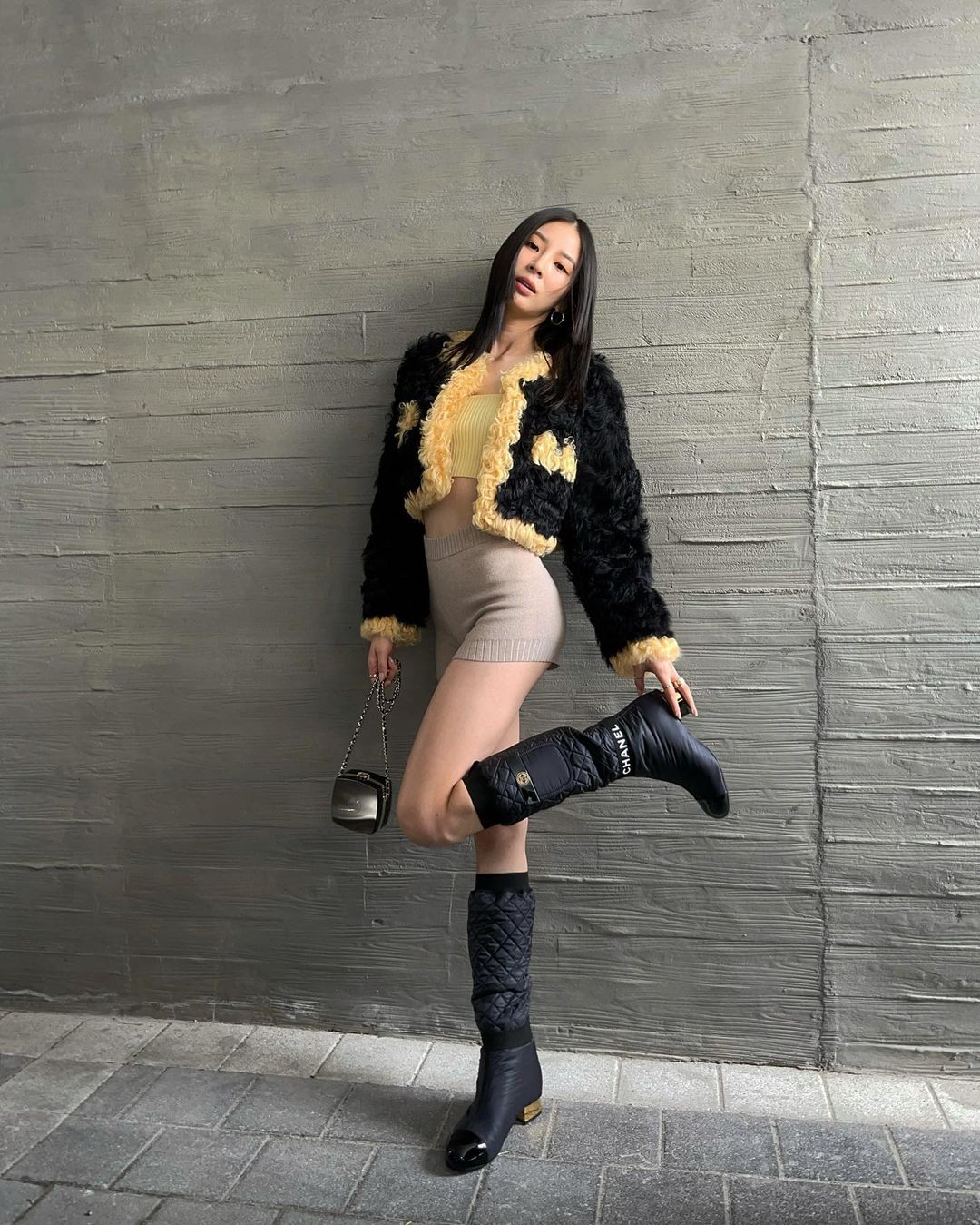 패딩 부츠는 포근한 패딩 소재로 이루어져 있기 때문에 보온성은 물론 착용감까지 좋다고 한다. 아이린은 배색 페이크 퍼에 니트 쇼츠와 함께 샤넬 패딩 부츠를 착용해 포인트를 주었다. 아이린처럼 쇼츠와 함께 연출해 패셔너블한 면모를 선보일 수도 있지만 추위에 약한 타입이라면, 스타킹과 함께 하거나 스키니 진과 함께 매치해 보는 것도 좋은 방법이다. 참고로 패딩부츠는 대부분 방한뿐만 아니라 방수에도 강해 눈보라에도 끄떡없는 잇 템 중 하나!
