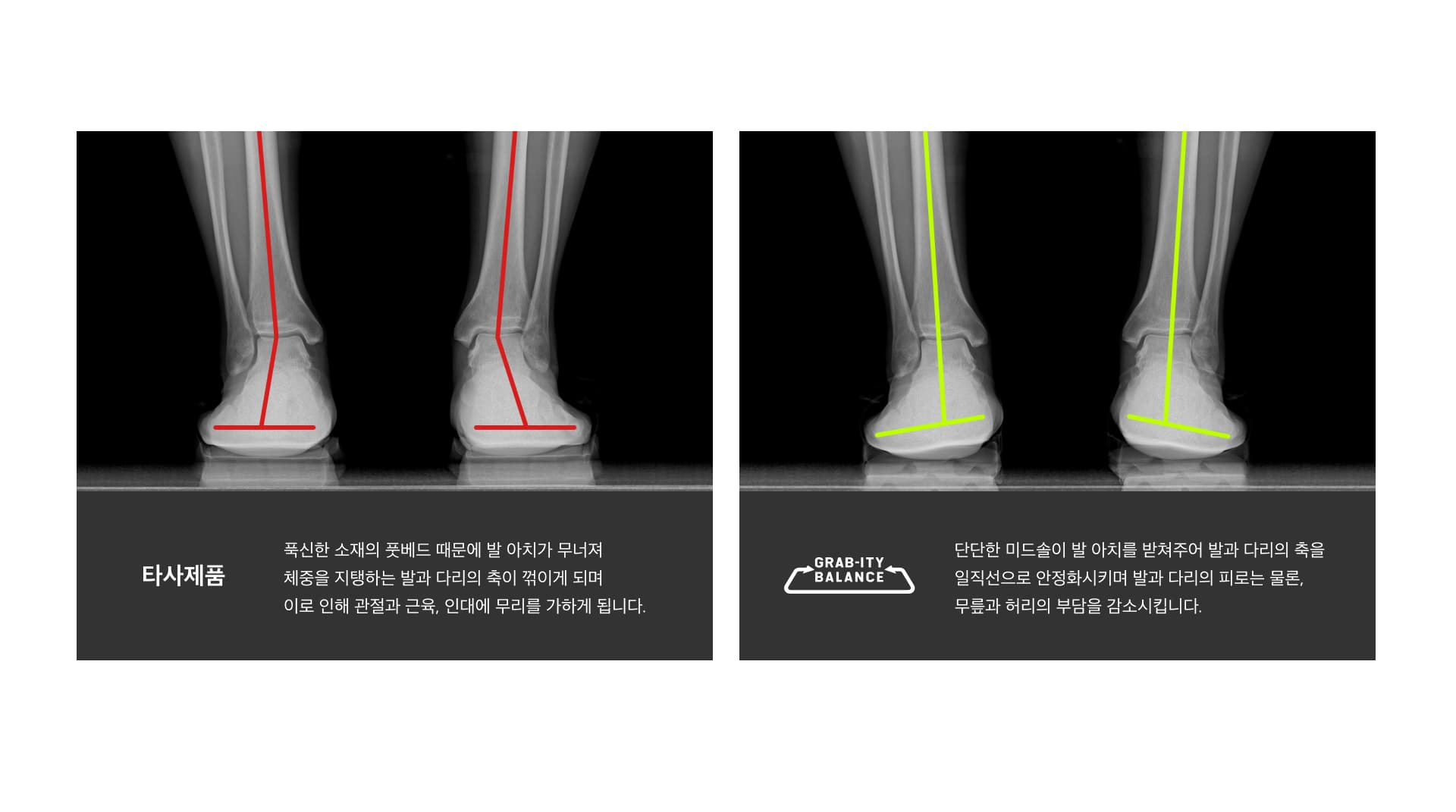 부드러운 미드솔과 단단한 아웃솔의 개념을 뒤집어서 아치를 받쳐주고 힐을 잡아주는 단단한 미드솔과 지면의 충격을 완화하는 부드러운 아웃솔로 상식을 뒤집는 2중 구조를 개발 합니다. 이 새로운 조합은 무릅과 골반의 하중부담을 분산시켜 신체 밸런스 향상과 몸의 피로회복에 도움을 준다고 합니다.