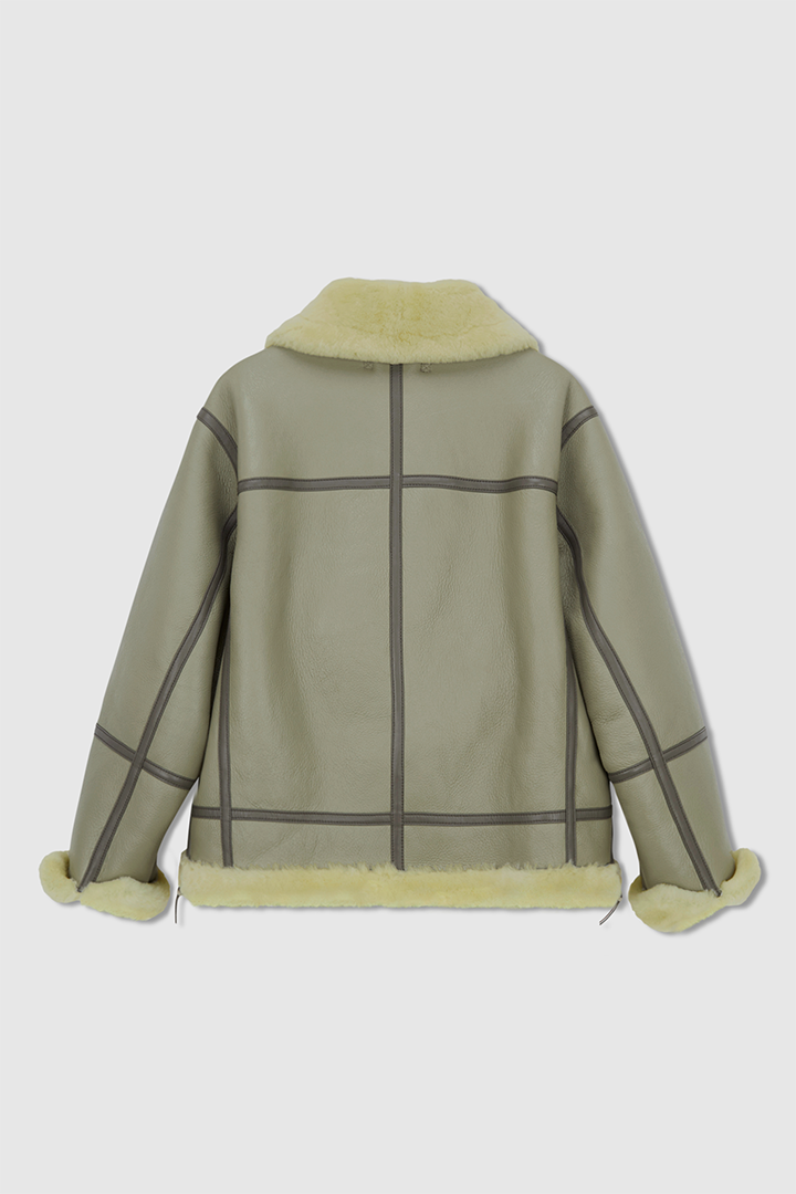 UK Lamb skin shearling jacket in greige. Stitched welt pocket on the side. Open side zipper for adjust sideline.