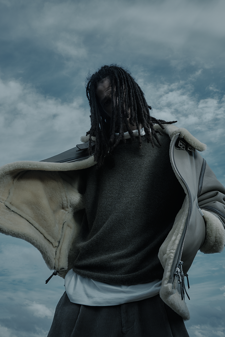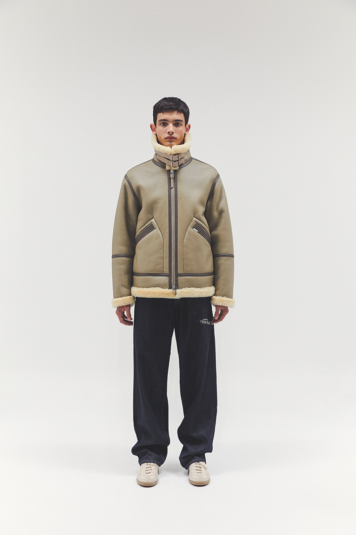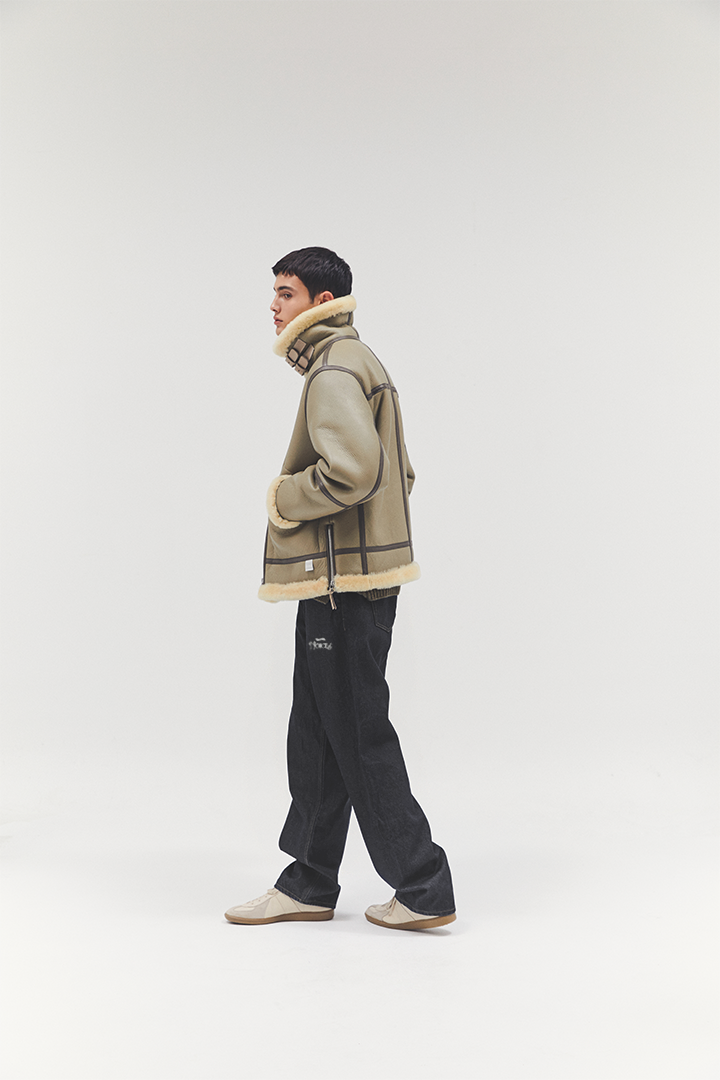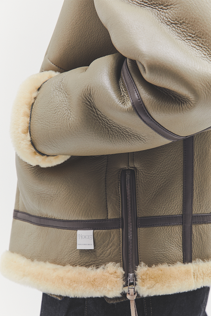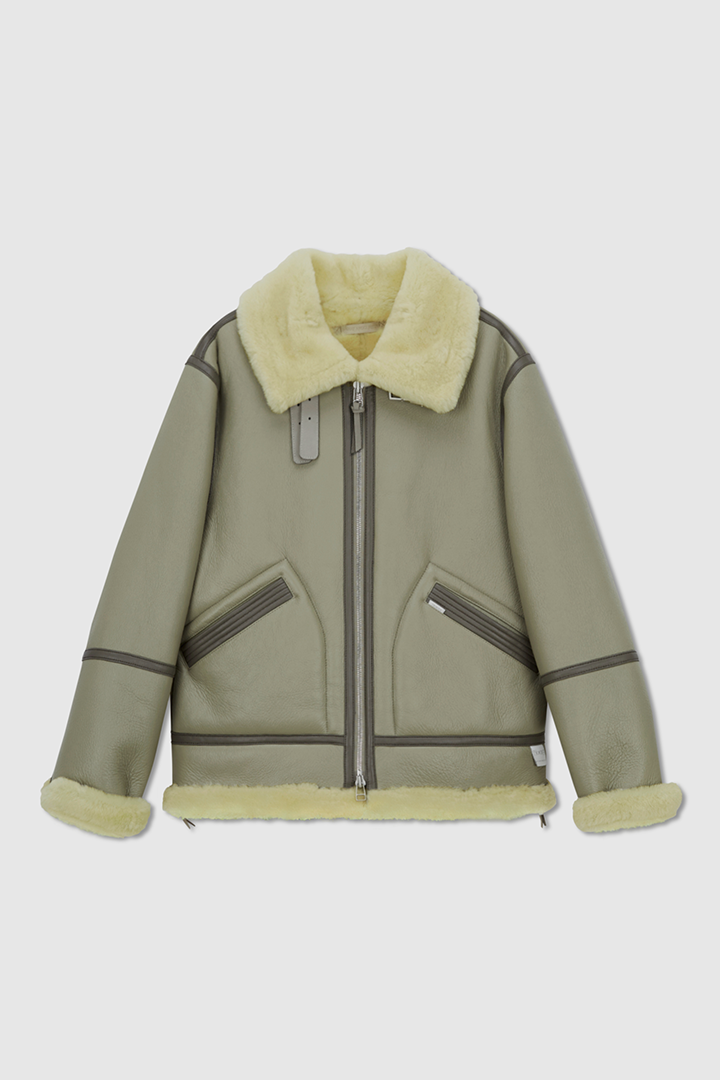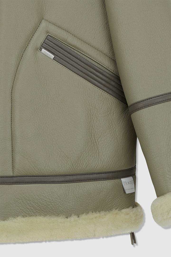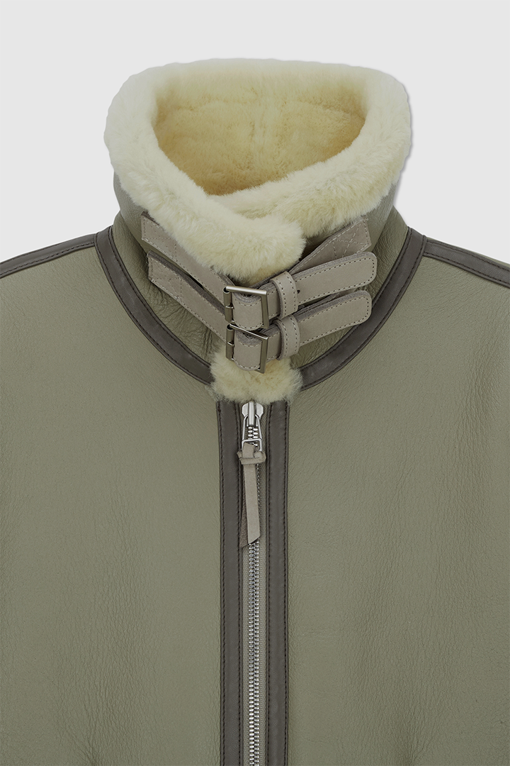 UK Lamb skin shearling jacket in greige. Stitched welt pocket on the side. Open side zipper for adjust sideline.