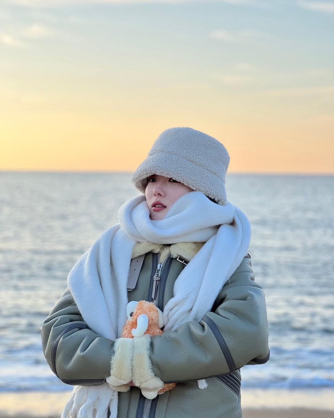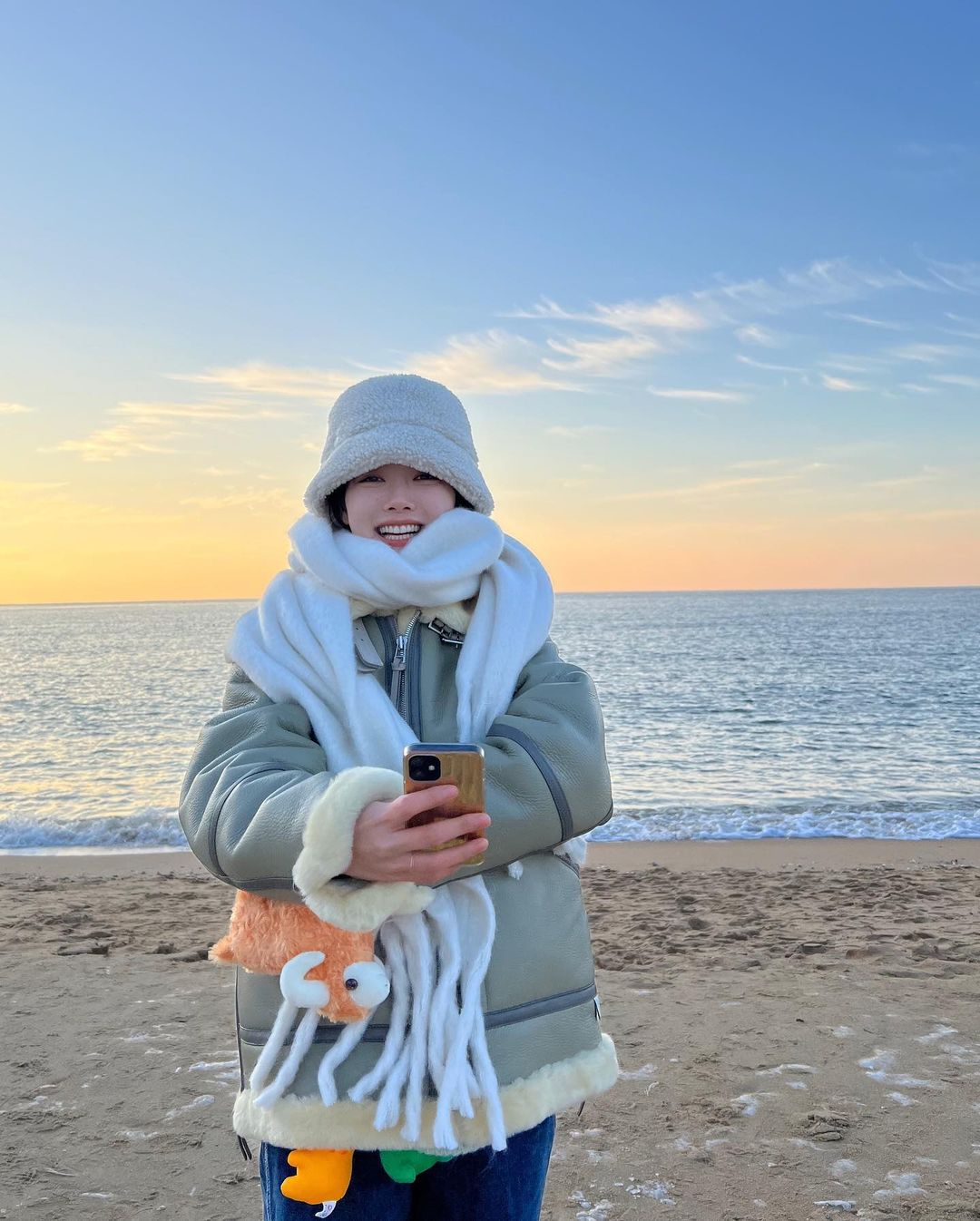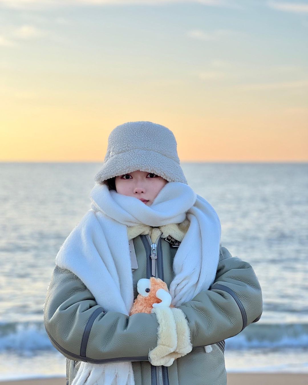 크리스마스날 인스타그럄에서 김유정 세젤귀 의 근황사진이 업데이트 되었습니다. 해변에서 김유정이 입은 무스탕!