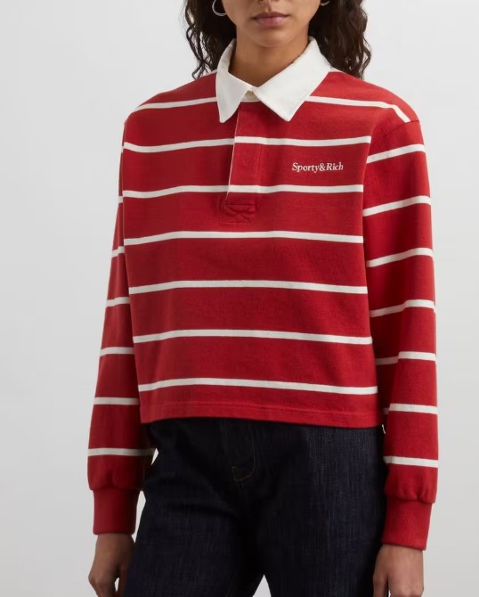 김지원의 공항 패션으로 등장한 스포티앤리치의 세리프 로고 럭비 폴로 티셔츠는 클래식한 럭비 저지에서 영감을 받아 탄생했다고 해요.