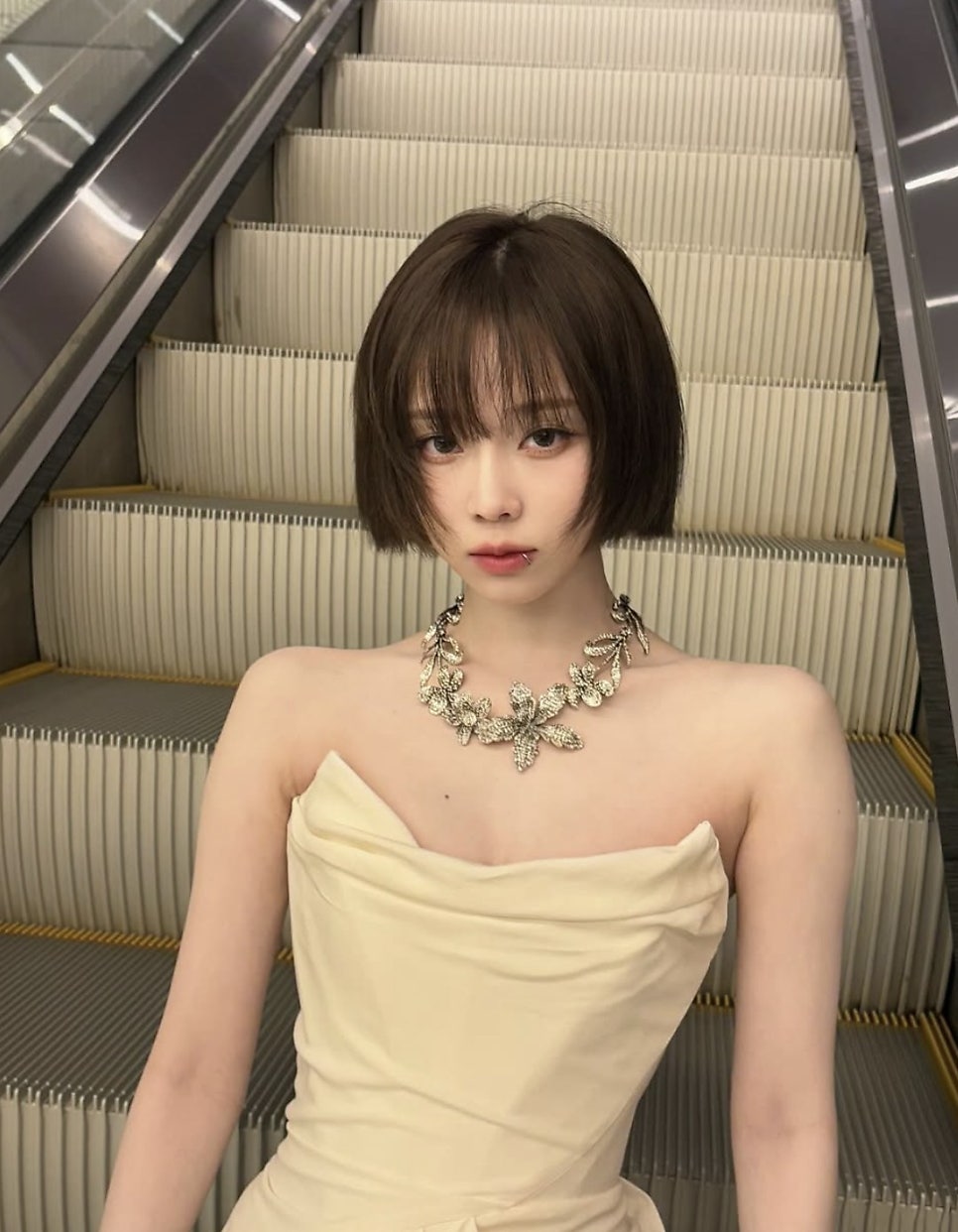 이른바 '치크컷'이라 불리는 이 스타일은 광대뼈 라인에서 머리카락이 컷되어 있어 얼굴형을 가장 효과적으로 보완해 주는 단발 스타일입니다. 윈터는 이 치크컷과 함께 페미닌하면서도 도시적인 분위기를 극대화하여 주목을 받기도 했습니다.