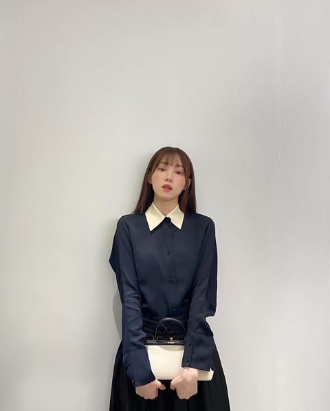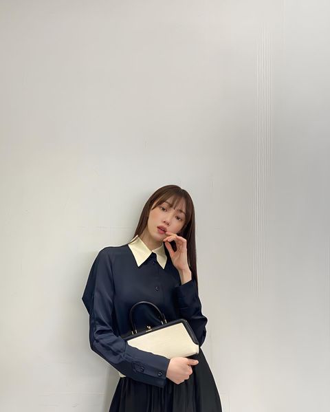 이성경의 스타일링이 대표적인 예다. 이성경은 넥 카라에 포인트 컬러가 들어간 네이비 컬러 블라우스와 롱 스커트를 함께 매치해 고급스러우면서도 여성스러운 룩을 선보였다. 이처럼 비슷한 컬러의 상, 하의를 매치하면 더욱 날씬해보이고, 길어보이는 룩을 완성할 수 있다. 또 이성경처럼 블라우스 셔츠를 모두 클로즈하여 착용하면 단정한 오피스 룩으로도 손색없다는 것도 참고해 둘 것.