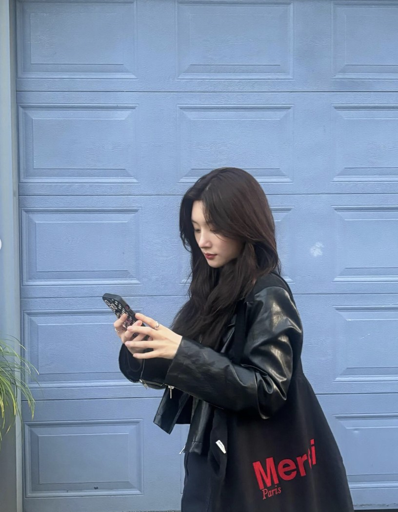 정채연은 이 토트백을 블랙 가죽 재킷과 함께 매치해 시크한 룩에 감각적인 컬러 포인트를 주는 방식으로 스타일링했는데요. 전체적인 톤을 정갈하게 유지하면서도 레드 로고가 시선을 사로잡아 룩에 생동감을 더해주었습니다.