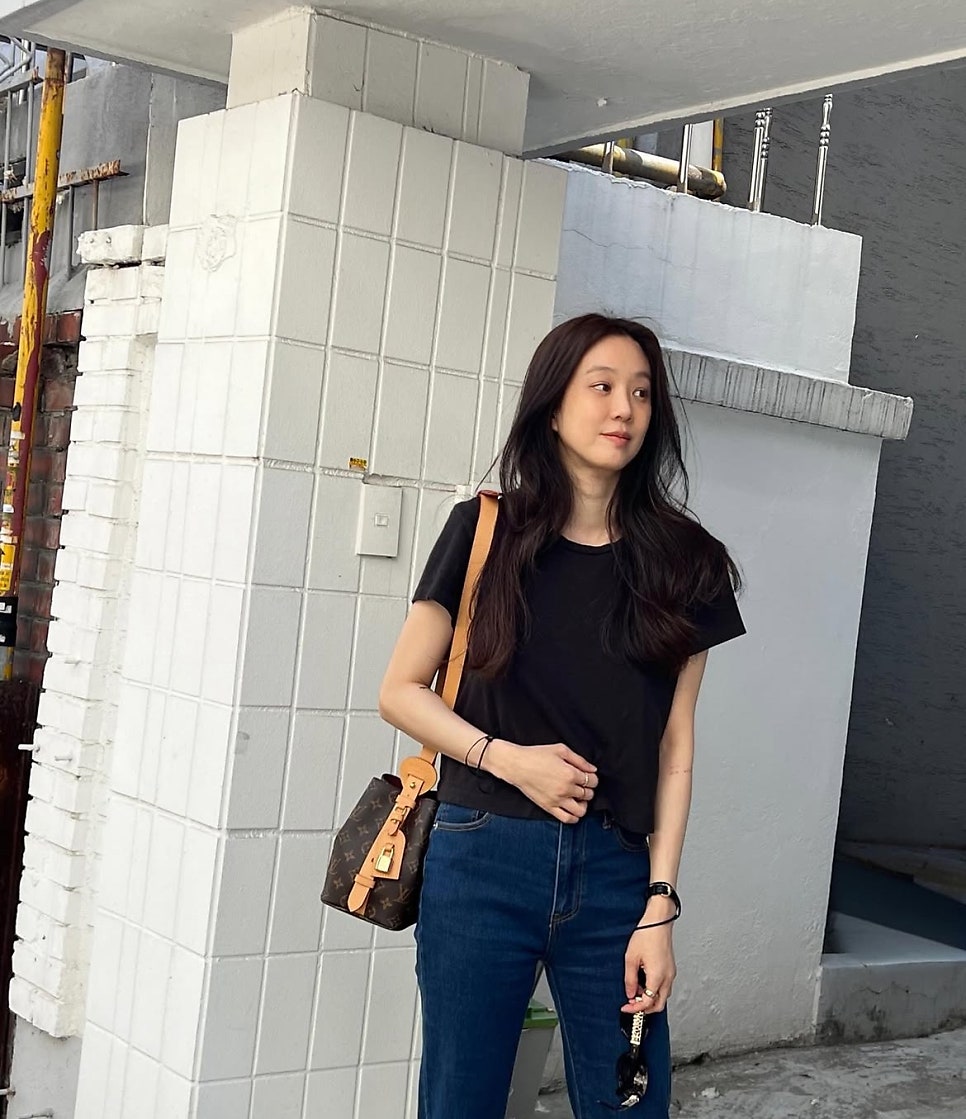 청바지에 검정 기본 티로 그녀의 산책룩은 비교적 단순했지만 그 옆에서 더욱 존재감을 드러낸 아이템이 있었으니... 로고만으로도 고급스러운 비주얼을 드러내는 루이비통 가방이었습니다.