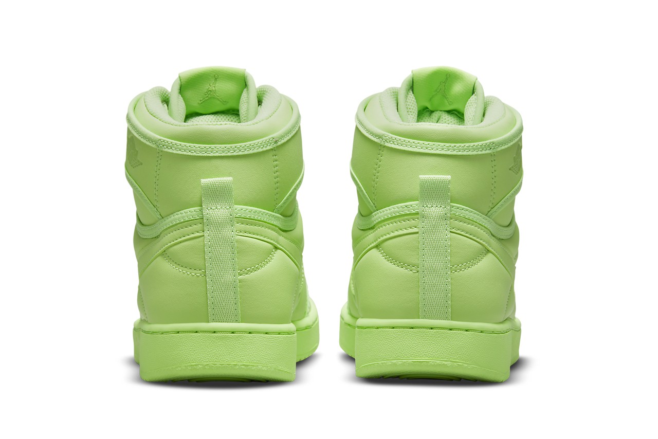 우선 빌리 아일리시와의 협업을 통해 탄생한 에어 조던 1 KO는 어디서도 시선을 끌 만한 밝은 시그니처 라임 그린 컬러로 이루어져 있다. 칼라 플랩에는 조던 윙 로고와 함께 AJKO라는 글자가 함께 새겨져 있으며, 텅에는 빌리 아일리시의 블로시 로고가 더해졌다. 그뿐만 아니라 쿼터 패널에는 더블 스티치 심 라인이 새겨졌으며 신발 전체 무게의 20%에 해당하는 부분이 재생 소재로 제작되었다는 점도 눈여겨볼 부분 중 하나!