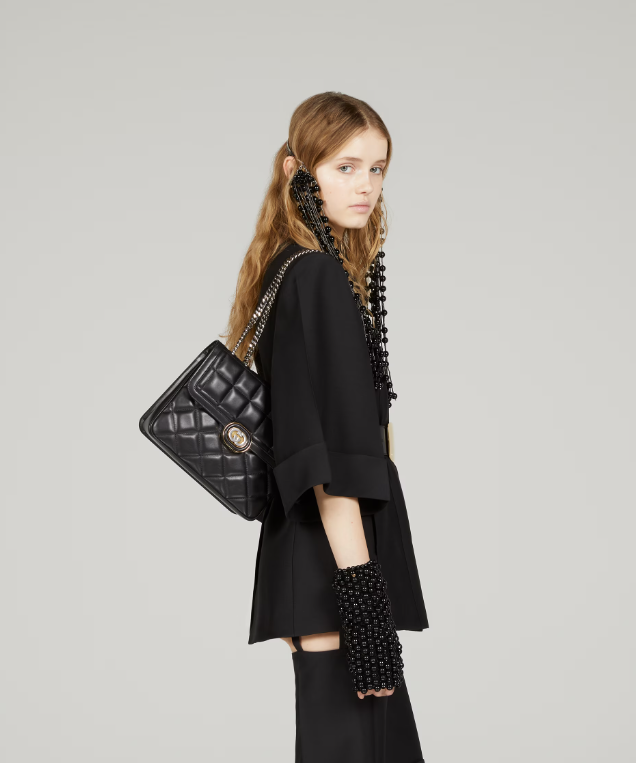 구찌의 2023 봄 여름 컬렉션 아이템 중 하나로 클래식한 실루엣이 특징이다. 블랙 퀼트 디자인과 레더 트리밍, 체인 숄더 트리밍으로 연출한 1970년대 레트로 감성이 돋보이는 아이템. 에센셜한 블랙 컬러로, 윈터 처럼 화려한 의상과 잘 어우러지는 편.