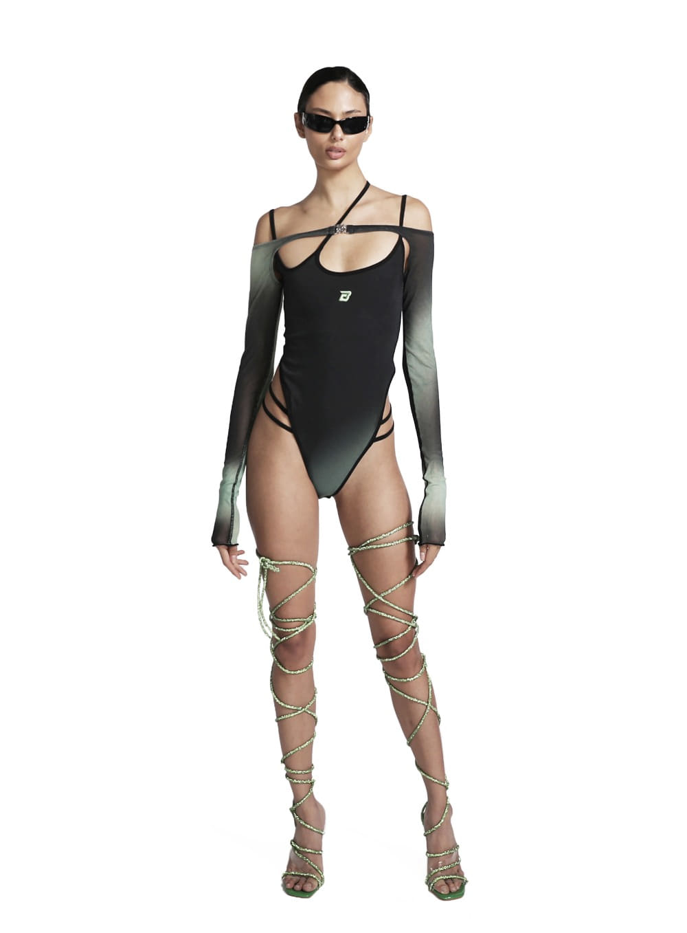 어깨의 사선 및 타이츠 라인 스트랩이 매력적인 보디수트 겸 스윔수트라고 할 수 있다. 통기성이 우수한 스판덱스 소재로 제작되었으며 져지 배색 안감으로 더욱 스타일리쉬하고 편하게 착용이 가능하다. 또 브리프 라인 역시 피부 자극을 최소화 하기 위해 부드러운 안감을 사용했다는 점도 알아 둘 것.