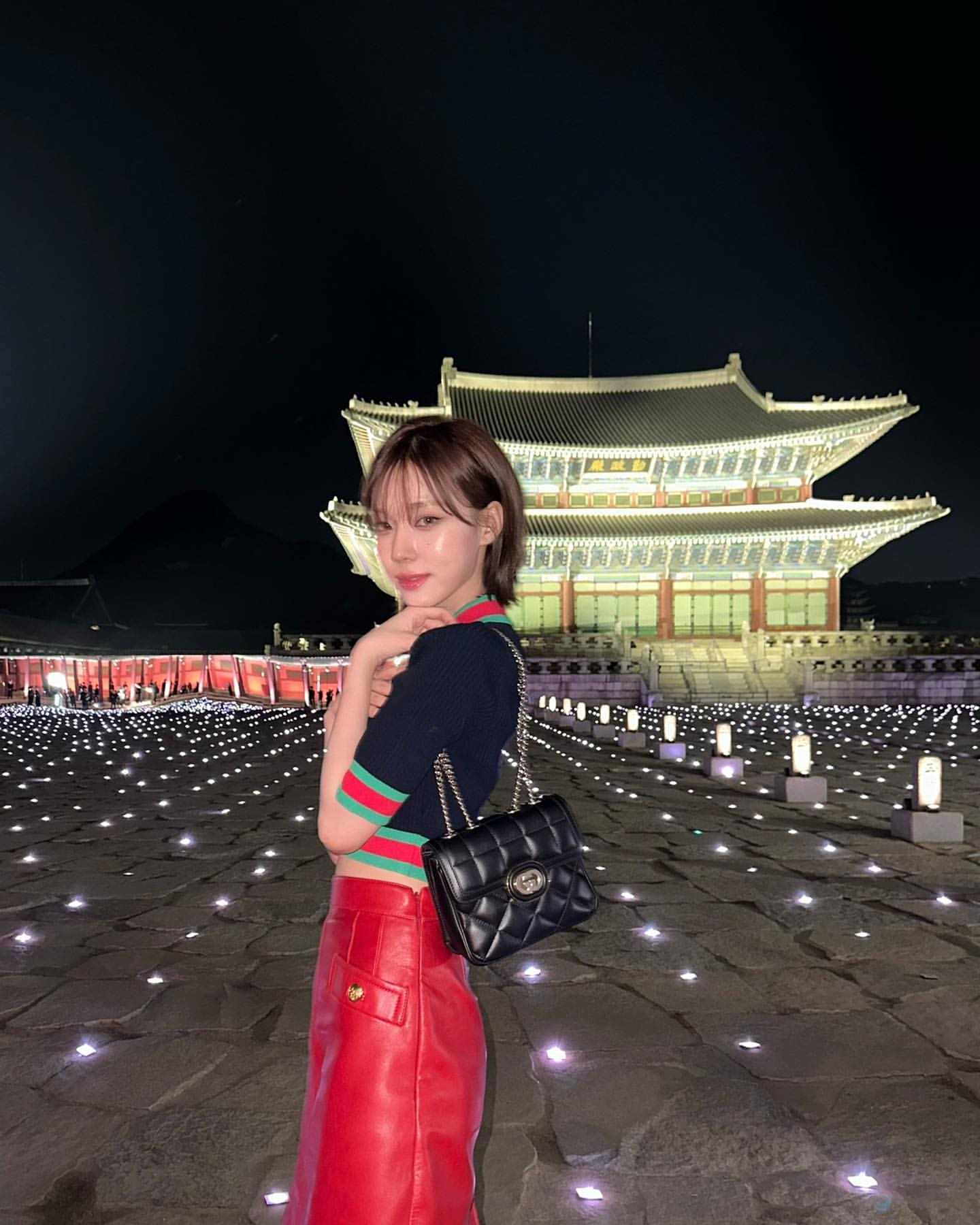 아시아 지역에서 처음 열린 '구찌 2024 크루즈 패션쇼'가 서울 경복궁에서 열렸다. 구찌 패션 쇼를 위해 경복궁을 찾은 윈터는 강렬한 레드 컬러 레더 스커트에 구찌의 시그너처 컬러로 구성된 크롭 폴로 셔츠 그리고 시니컬한 블랙 숄더 백을 매치해 스타일리시한 면모를 선보였다.