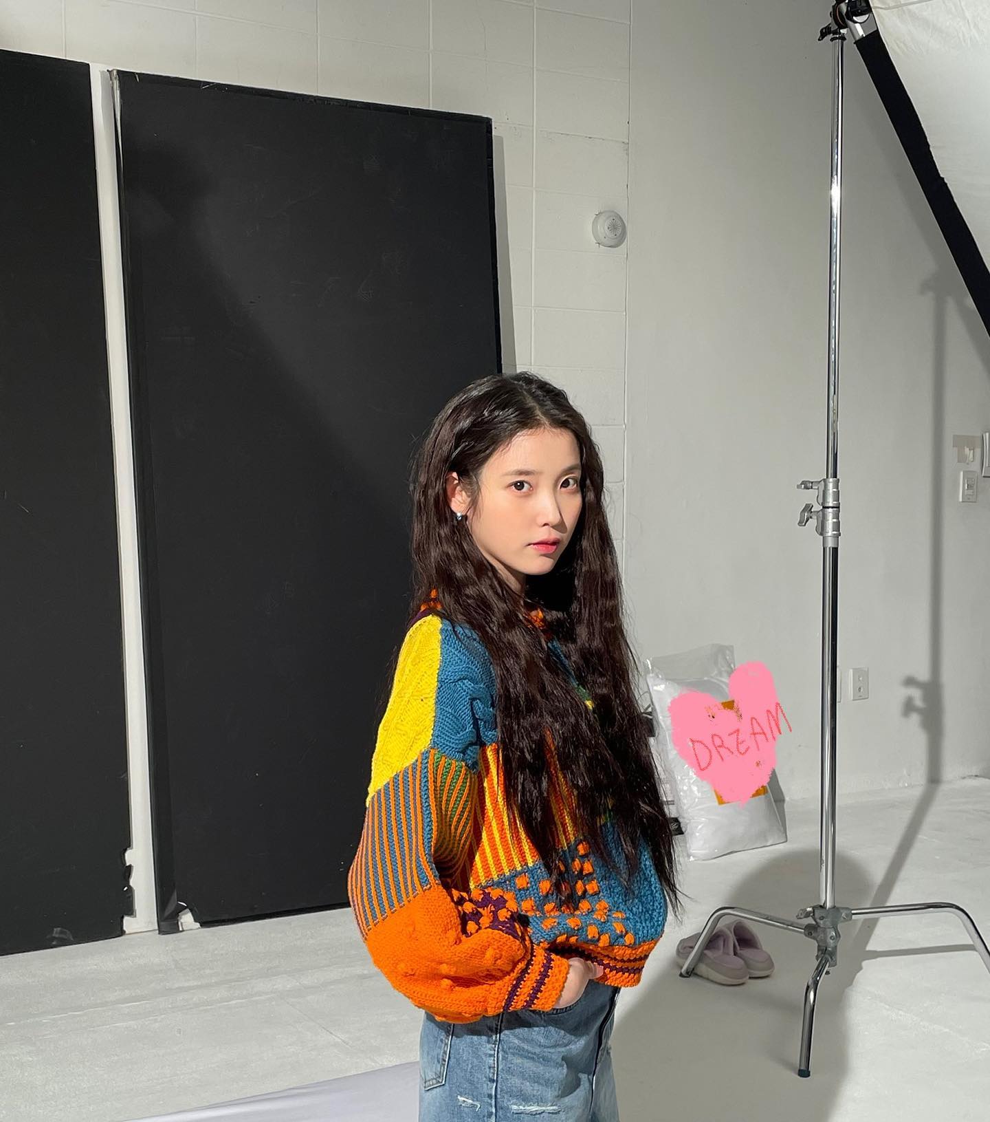 평소 수수하고 깔끔한 니트나 스웨터 아이템을 주로 착용하는 아이유. 최근 화보 촬영장에서 독특한 패턴과 비비드한 컬러의 패치워크 니트에 데님 진을 매치해 스타일리시하면서도 귀여운 간절기 패션을 선보였다. 할머니 옷장을 연상시키는 빈티지한 무드의 니트는 하우스 브랜드 겐조의 '패치워크 버블 슬리브 니트'.