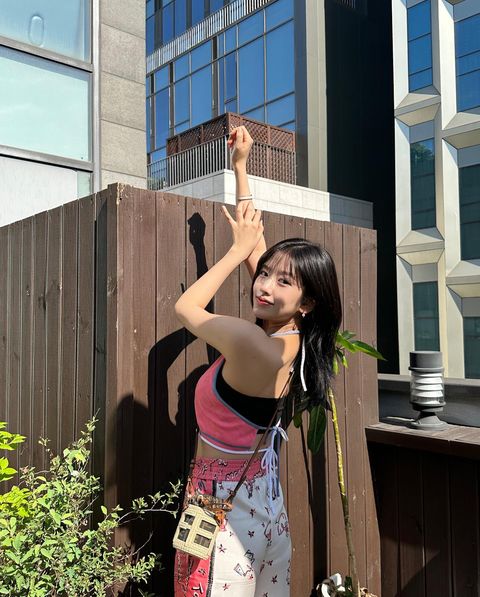 앞서 언급했지만 패션 하우스 브랜드, 펜디의 한국 엠버서더로 활발히 활동중인 안유진. 그녀는 홀터넥 슬리브리스 민소매에 키치한 패턴이 들어간 실크 팬츠를 활용해 청순하면서도 여성스러운 무드를 선보였다. 여기가볍고 시원해 보이는 여름 소재, 스트로를 활용한 미니백을 더해 휴양지 온 것 같은 느낌도 함께 연출했다.