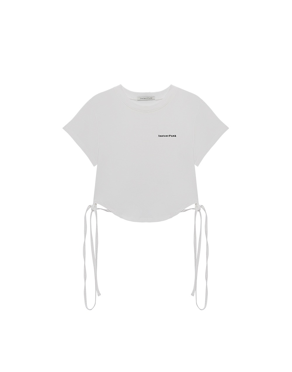 옆선 아래 스트링 디테일로 길게 늘어뜨러 연출하거나, 매듭 지어 착용하거나, 취향에 맞게 코디하기 좋은 아이템이다. 게다가 밑단이 둥근 형태로 디자인 되어 한층 슬림한 실루엣을 연출할 수 있다. 왼쪽 가슴에 위트있게 새겨진 인스턴트펑크 자수 포인트도 눈여겨 볼 것.