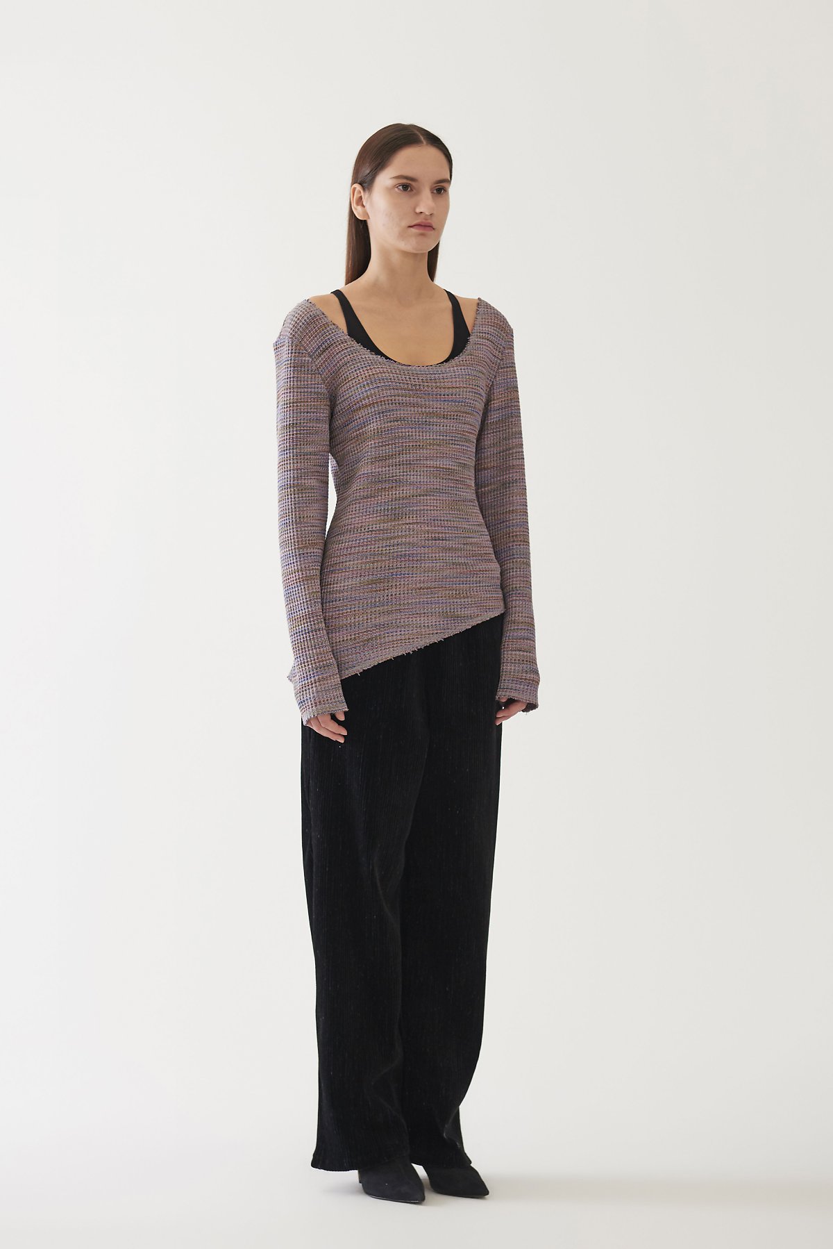 아이유가 선택한 컬러감이 믹스 된 유넥 니트 탑은 끝단 사선 컷팅과 자연스러운 올 풀림 디테일이 매력적인 제품. 게다가 허리 라인에 슬림한 패턴이 가미되어 있어 허리라인을 한층 얇아보이게 만들어준다. 단품으로 착용해도 좋지만 아이유처럼 이너가 살짝 보이도록 착용해주는 것도 추천!