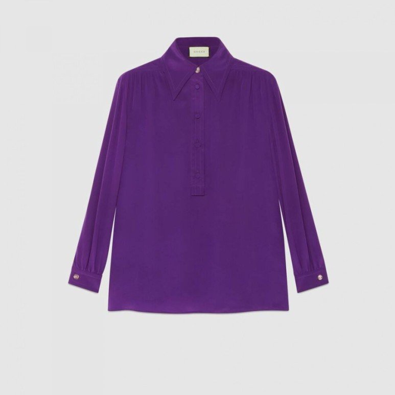 아이유 뮤직비디오를 봤다면 한 번쯤 봤을 법한 라일락 컬러의 블라우스. 보라색이 주는 고급스러우면서도 신비러운 분위기가 아이유와 너무 잘 어울렸던 아이템 중 하나로 라일락 컬러 블라우스는 명품 하우스 브랜드, 구찌의 제품.