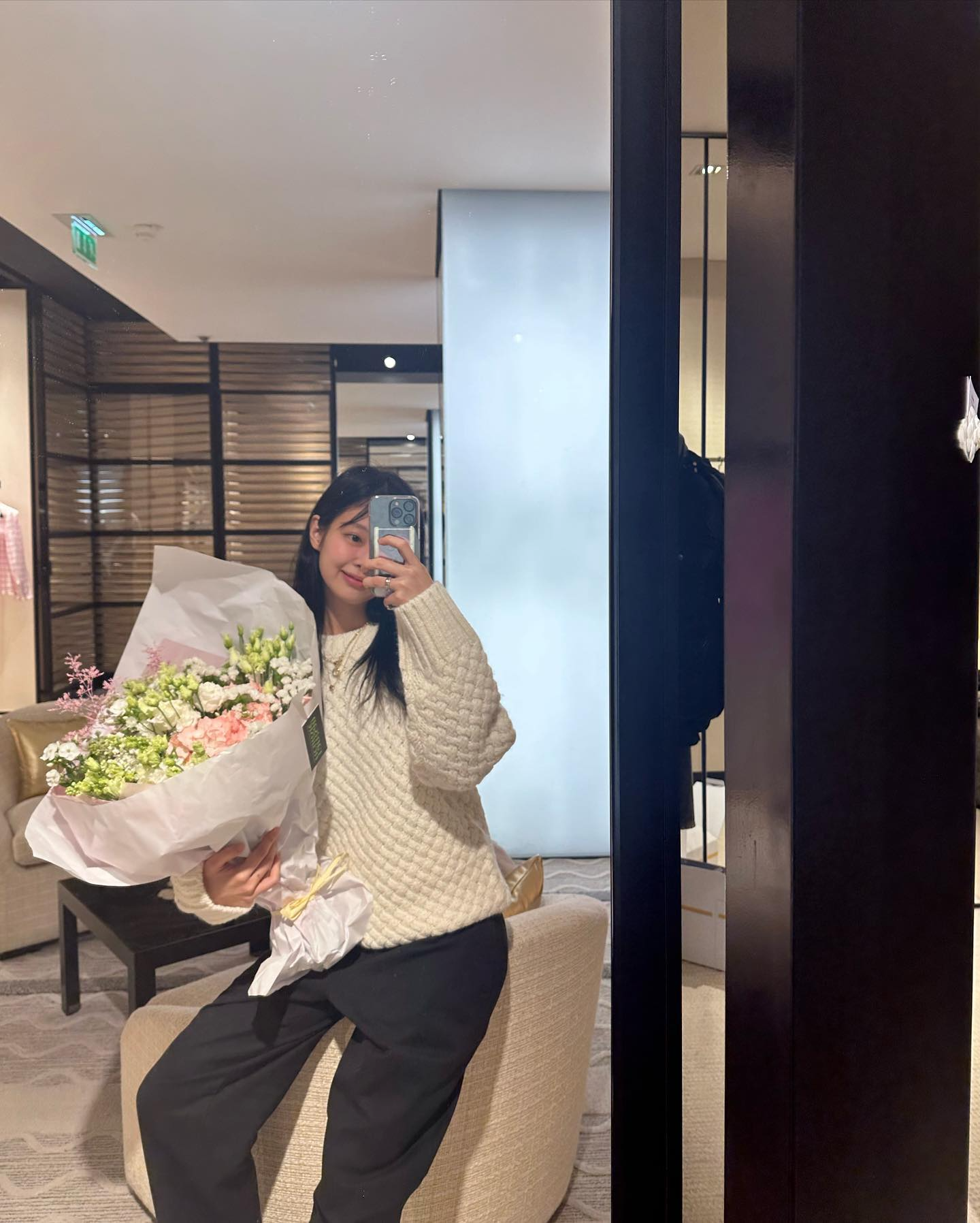 최근 제니는 프랑스 여행 중 큰 꽃다발과 함께 편안한 원 마일 웨어 룩을 선보였다. 포근한 무드의 화이트 니트 스웨터에 블랙 팬츠를 매치한 것. 제니가 선택한 케이블 니트 스웨터는 모던한 미니멀리즘이 매력적인 브랜드, 아모멘토의 크로셰이 니트 풀오버.