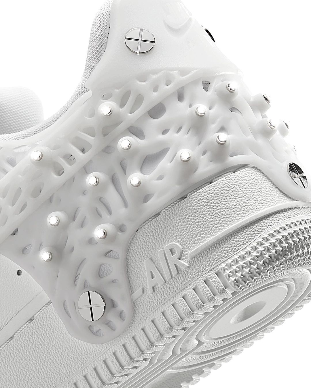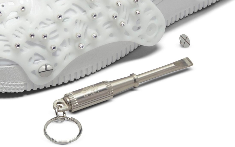 구조적이면서도 입체적인, 유니크한 무드를 잔뜩 풍기는 이번 스와로브스키 X 나이키 에어포스1 로우는 탈착 가능한 스와로브스키 크리스탈 장식 패널이 신발 전체를 감싸고 있는 실루엣으로 이루어져 있으며 패널 가장자리와 미드솔이 나사로 고정되어 있다. 그렇기 때문에 패널을 분리할 때 사용할 전용 스크루 드라이버가 함께 증정된다. 또한 슈 박스에 포함된 미니 스크루 드라이버에도 역시 나이키 브랜딩이 새겨져 있는 점도 참고해 둘 것.