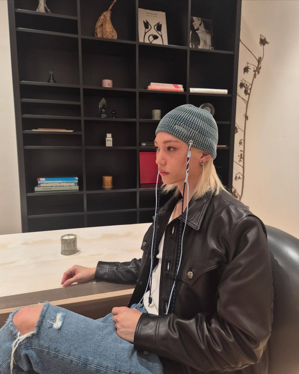 스트레이 키즈 필릭스는 멋스러운 블랙 가죽 재킷에 데님 팬츠 그리고 유니크한 어티슈 비니를 매치했는데요.