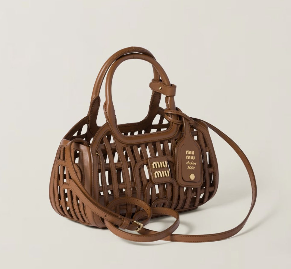 그녀가 착용한 가방은 미우미우의 ‘가죽 바스켓’입니다. 이 제품은 미우미우의 2025년 SS 컬렉션에서 선보인 신상으로, 바스켓 쉐입이 돋보이는 독특한 디자인이 특징이에요!