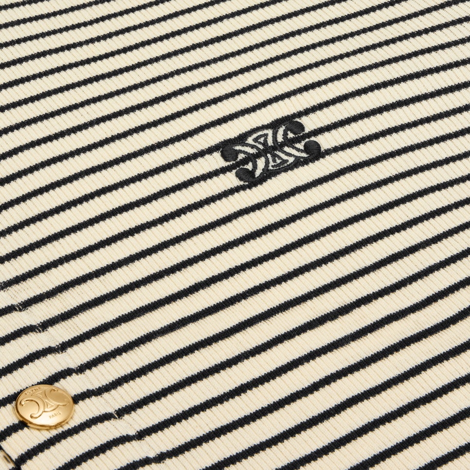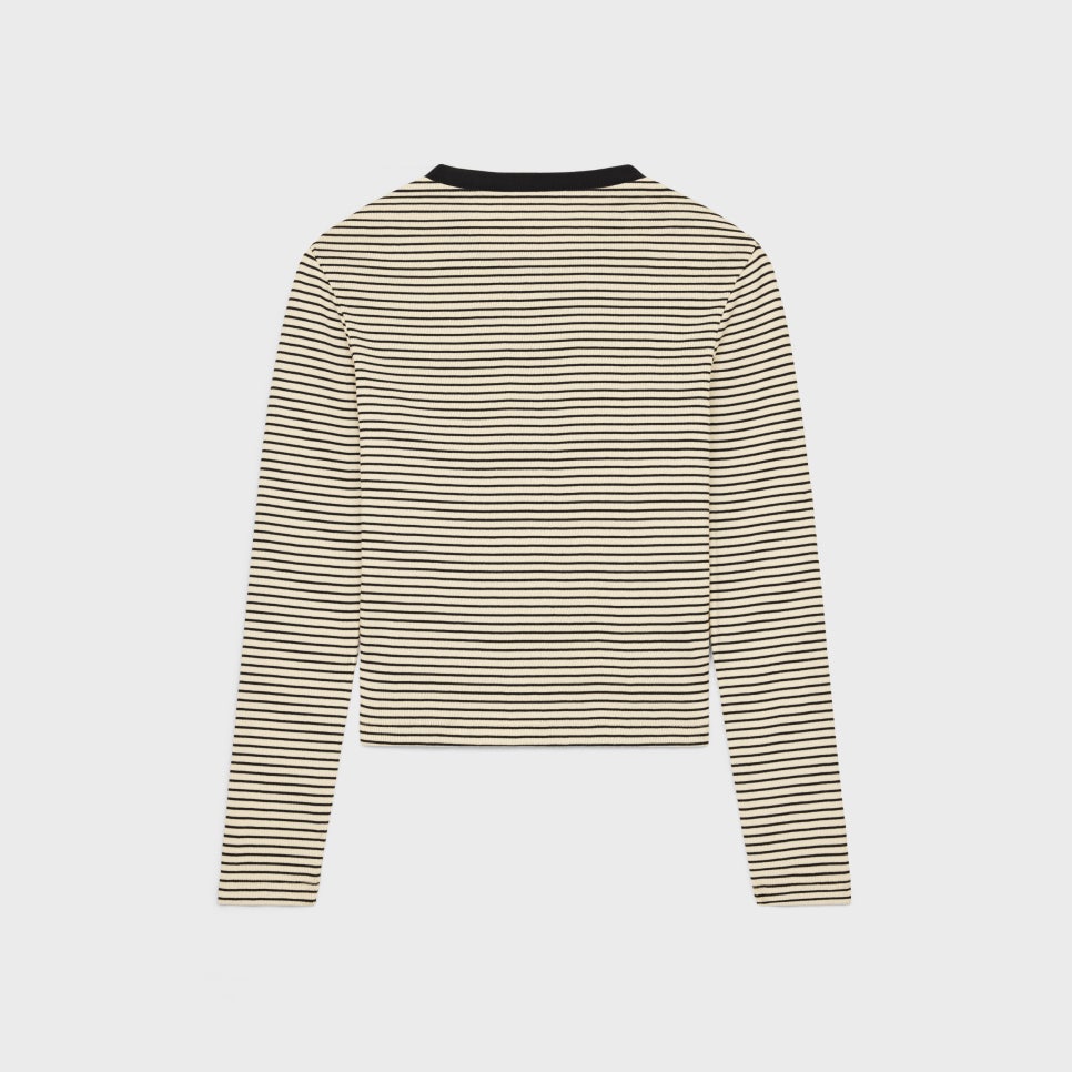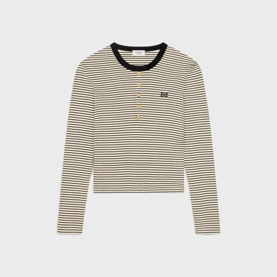 이 티셔츠는 셀린느의 2025년 신제품이라고 할 수 있는데요. 크림과 블랙 컬러가 함께 믹스 되어 있는 제품이에요. 전체적으로 크림 컬러 베이스에 블랙 스트라이프 패턴으로 구성되어 있어 부드러우면서도 여성스러운 느낌을 함께 선사해주는데요.