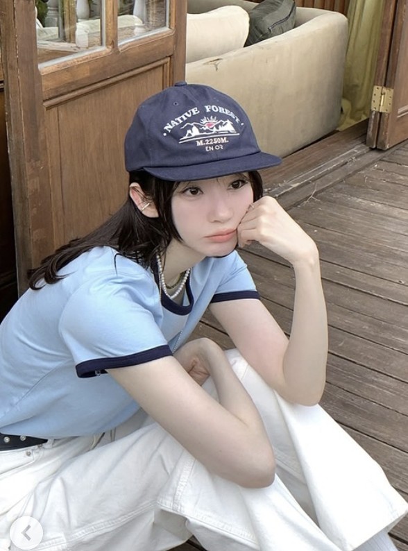 옷잘알 강민경 또한 플랫한 모양의 볼캡을 종종 착용하곤 하는데요, 사진 속 그녀는 네이비 컬러의 로고 볼캡에 깔끔한 배색 라운드 티셔츠와 화이트 팬츠를 매치하여 2000년대 무드의 프레피 캐주얼을 완성하고 있습니다.