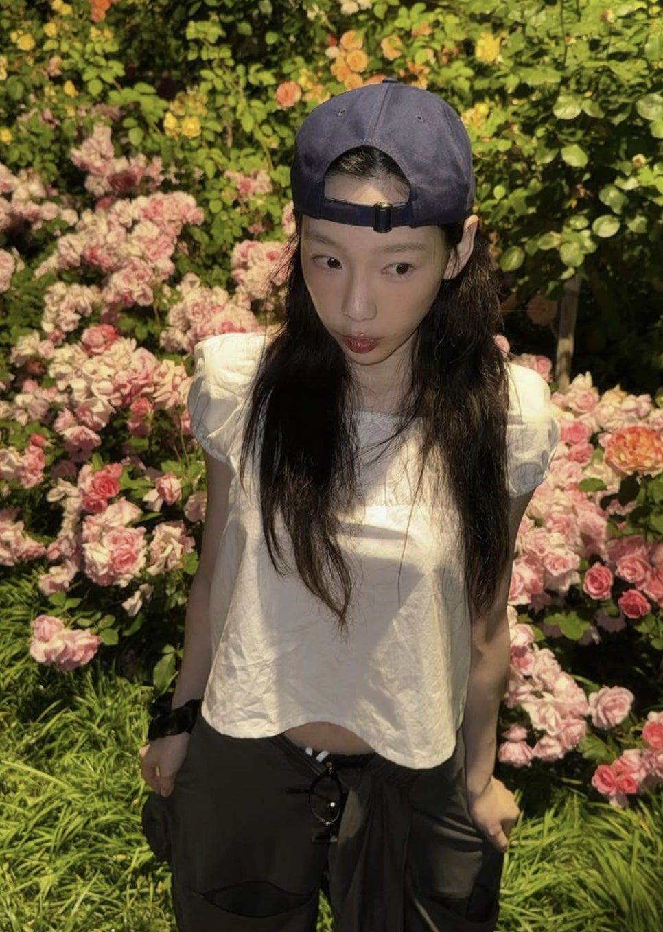특히 모자 챙을 뒤로 돌려 착용하면 좀 더 힙하고 꾸안꾸 느낌의 코디가 완성됩니다. 사진 속 태연도 볼캡을 뒤로 착용하여 장난꾸러기의 분위기를 물씬 풍기고 있는데요, 내추럴한 헤어와 흰 티, 와이드 팬츠에 네이비 볼캡 하나만 얹었을 뿐인데도 감각적인 스트릿 무드가 한가득인 코디 방법입니다!