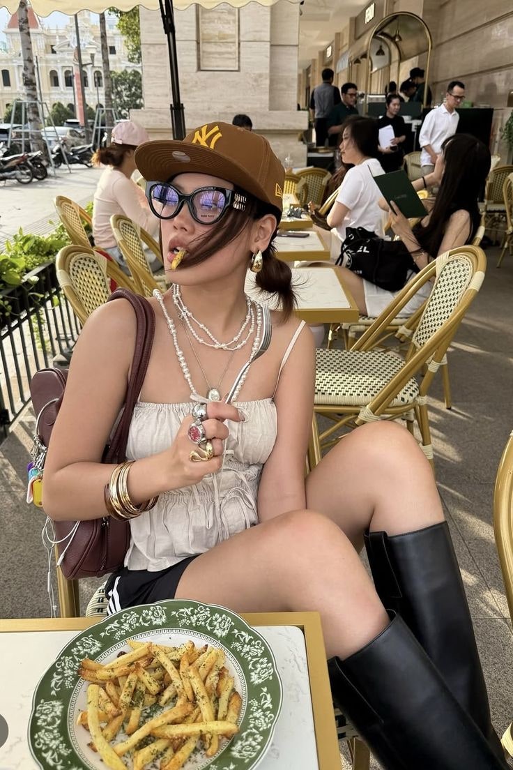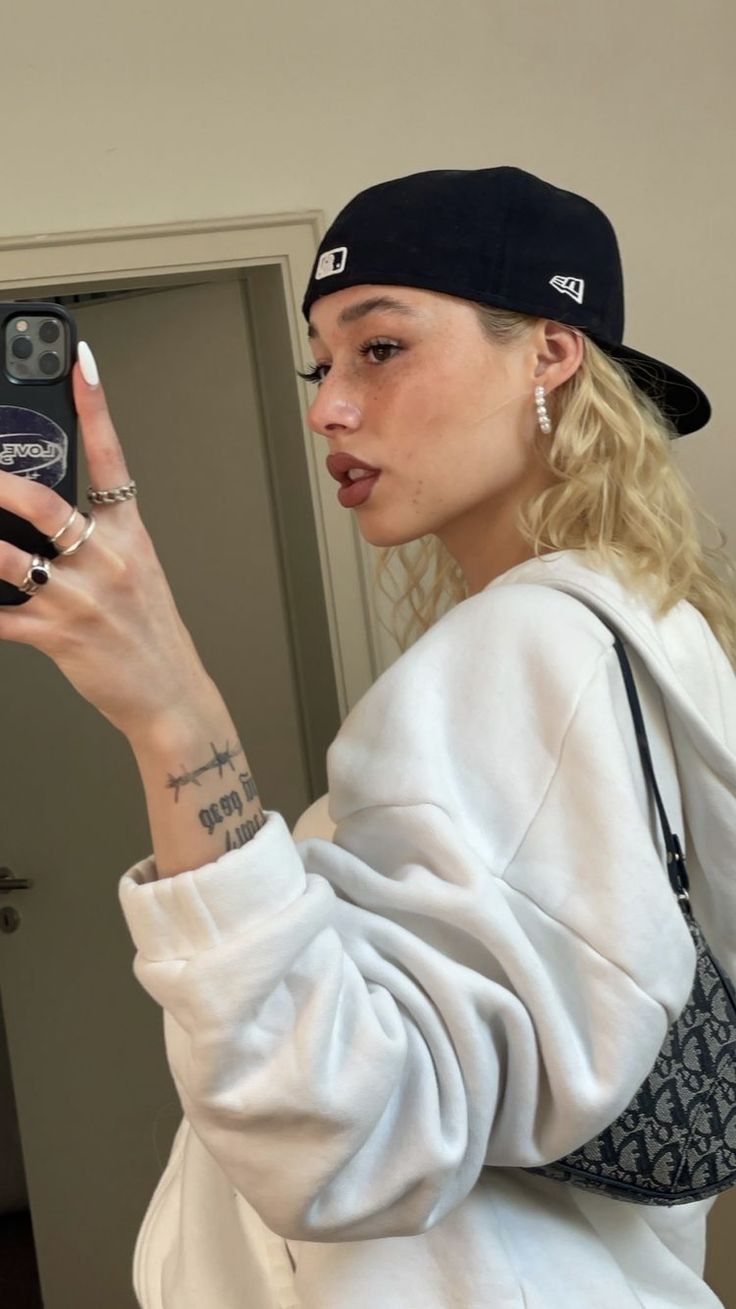 옷잘알 강민경 또한 플랫한 모양의 볼캡을 종종 착용하곤 하는데요, 사진 속 그녀는 네이비 컬러의 로고 볼캡에 깔끔한 배색 라운드 티셔츠와 화이트 팬츠를 매치하여 2000년대 무드의 프레피 캐주얼을 완성하고 있습니다.