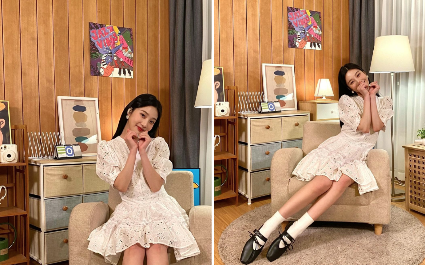 화이트 컬러 아일렛 원피스는 산뜻하면서도 청순한 매력을 지닌 아이템이다. 레드벨벳 대표 과즙상 조이는 프랑스 브랜드 마쥬의 기퓌르 스케이트 원피스에 화이트 삭스, 블랙 플랫 슈즈를 매치해 한층 더 세련된 분위기를 주었다. 여기에 타티아나 주얼리의 진주 이어링을 함께 매치해 더욱 눈길을 끌었다는 후문!