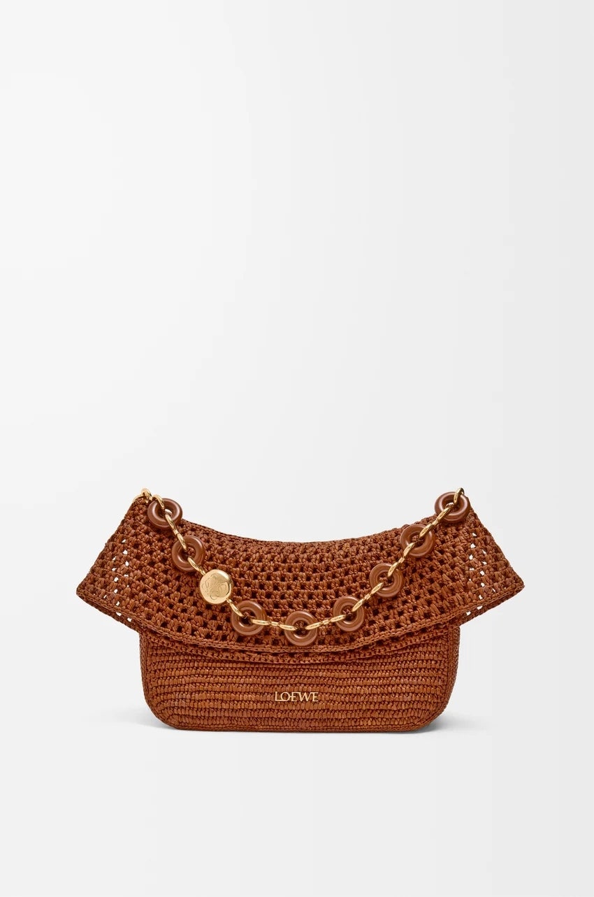 로에베가 선보이는 올라백은 전체적으로 곡선형 실루엣으로 구성되어 더욱 스타일리시한 느낌을 선사해주는 라피아백입니다. 한층 부드럽고 유려하게 흐르는 플랩과 유니크한 도넛 체인이 어우러져 이국적이면서도 예술적인 느낌을 선사해주는데요. 도심과 휴양지 어느 곳에서나 유용하게 활용할 수 있는 라피아백이라고 할 수 있어요!