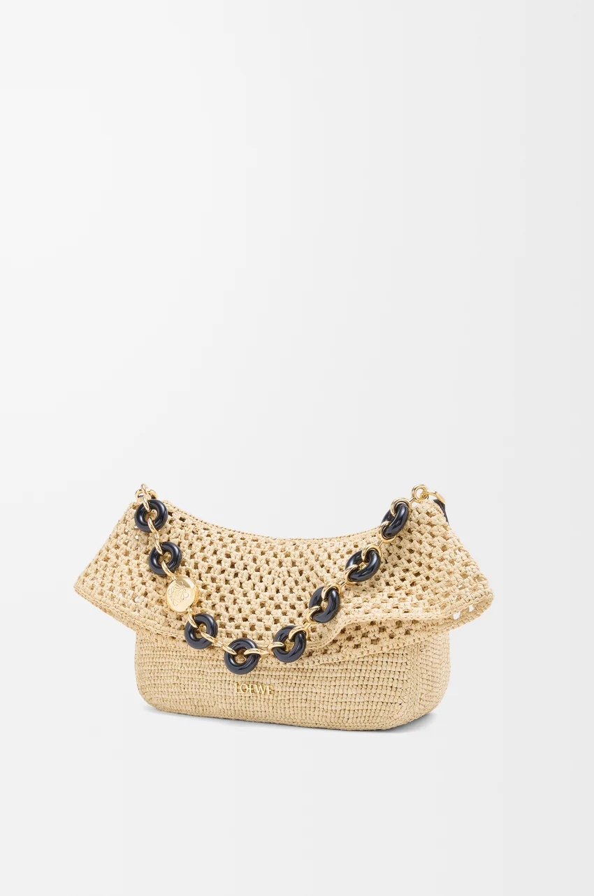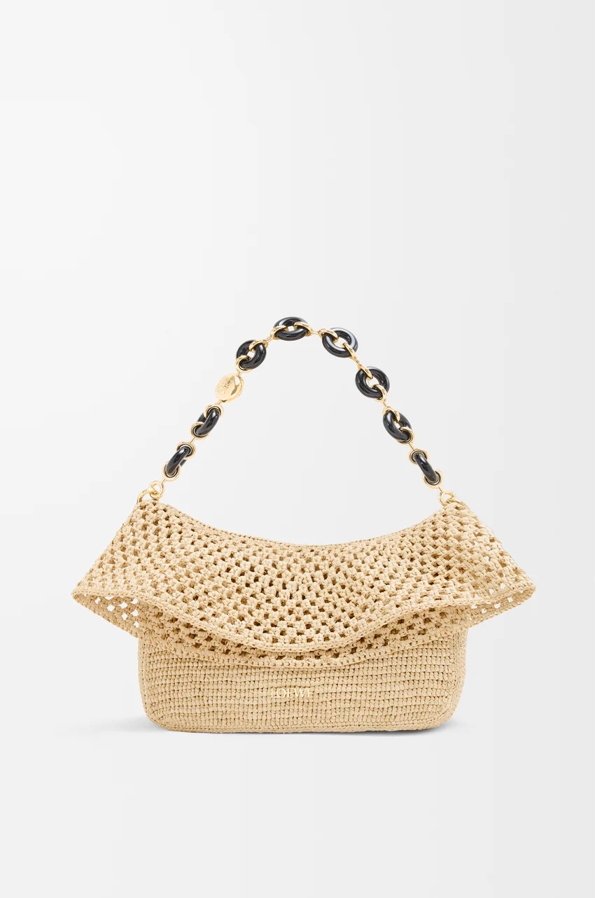 The Ola is a soft, lightweight and versatile summer bag defined by a curved body, a flowing flap and a statement donut chain. This medium version is crafted in raffia with calfskin details. *Detachable tubular calfskin strap, donut chain *Flap closure *One