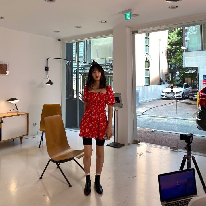 바이커 쇼츠라고 해서 무조건 티셔츠에다가만 입으라는 법은 없다. 배우 윤승아는 바이커 쇼츠 위에 짧은 기장의 미니 드레스를 매치해 걸리시한 아웃핏을 선보였다. 화려한 패턴과 톡톡 튀는 레드 컬러의 드레스를 입을 때는 어두운 계열 바이커 쇼츠와 블랙 워커를 착용해 너무 과하지 않게 스타일링한 그녀의 센스도 눈여겨 볼 것.
