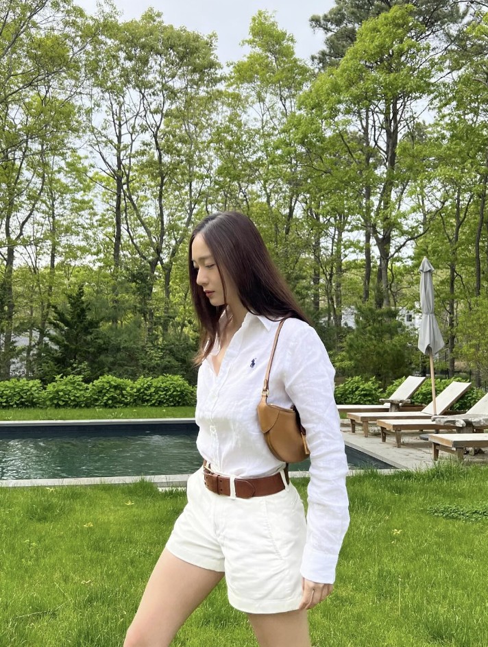 사진 속 정수정은 폴로 랄프로렌 린넨 셔츠를 단독으로 착용하였는데요, 버튼을 모두 클로징하지 않고 살짝 오픈하여 그녀만의 쿨한 무드를 더욱 강조해주고 있습니다. 거기에 셔츠와 매치되는 아이보리색 반바지와 함께 착용하여 편안하면서도 세련된 데일리룩을 완성 💖