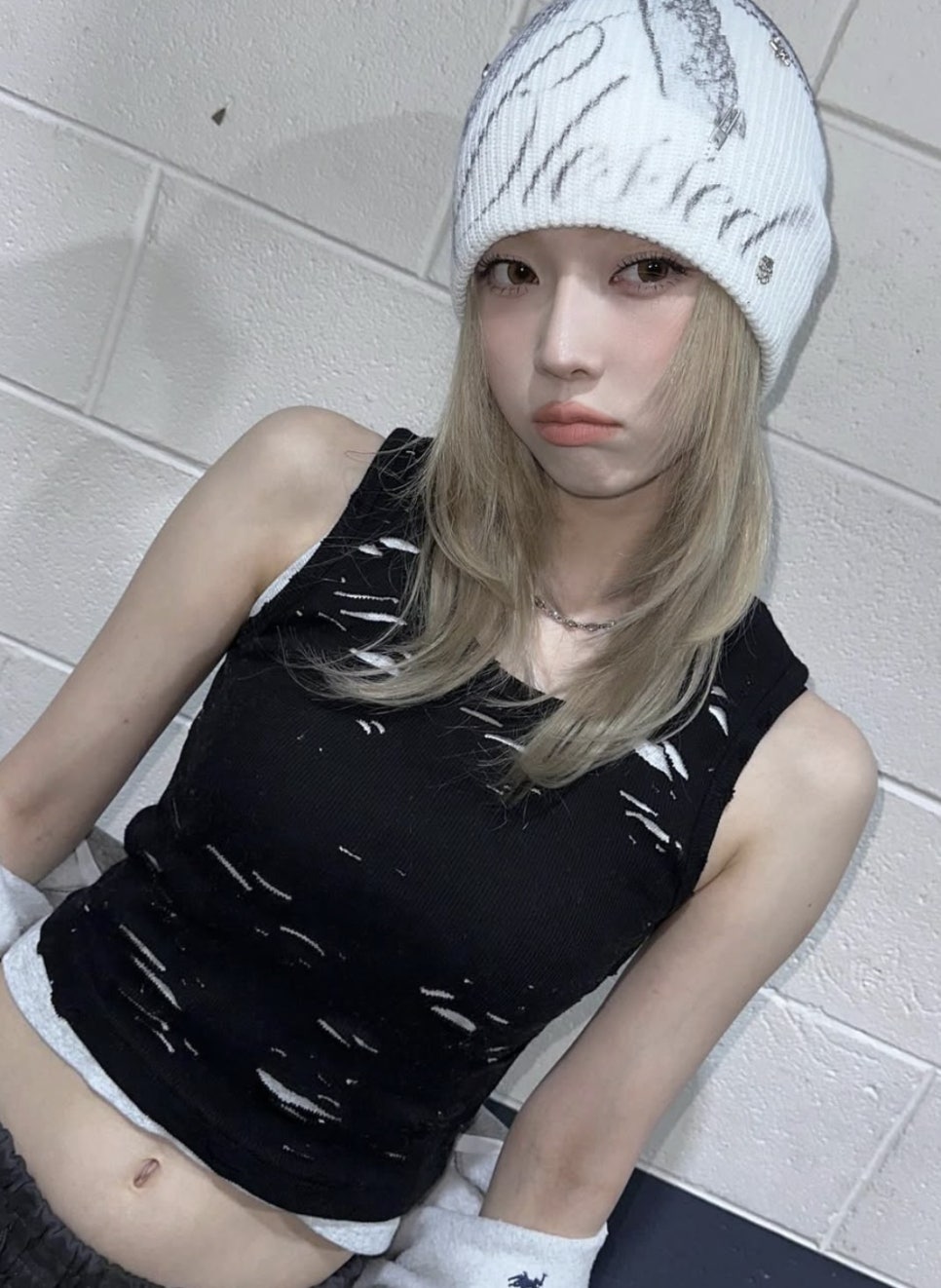 이러한 중단발 레이어드는 특히 비니와 같은 스트릿한 분위기의 소품과 가장 잘 어울리는 헤어 중 하나인데요. 사진 속 윈터는 흰색 비니를 착용하여 더욱 작은 얼굴을 연출하고 있습니다. 관련 스타일에 관심이 많으신 분들께 추천드리고 싶은 헤어스타일입니다!
