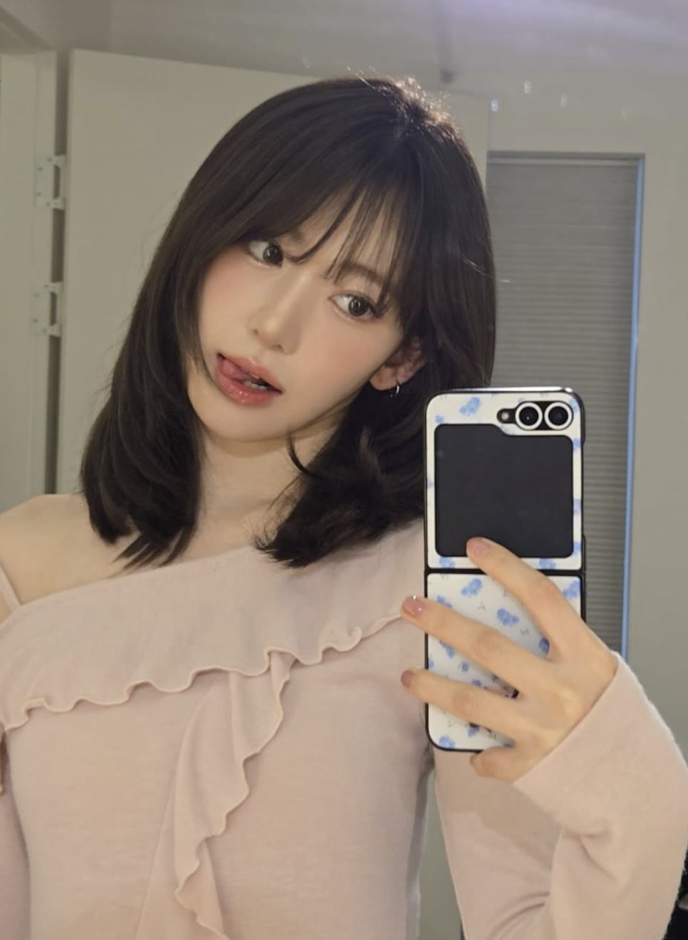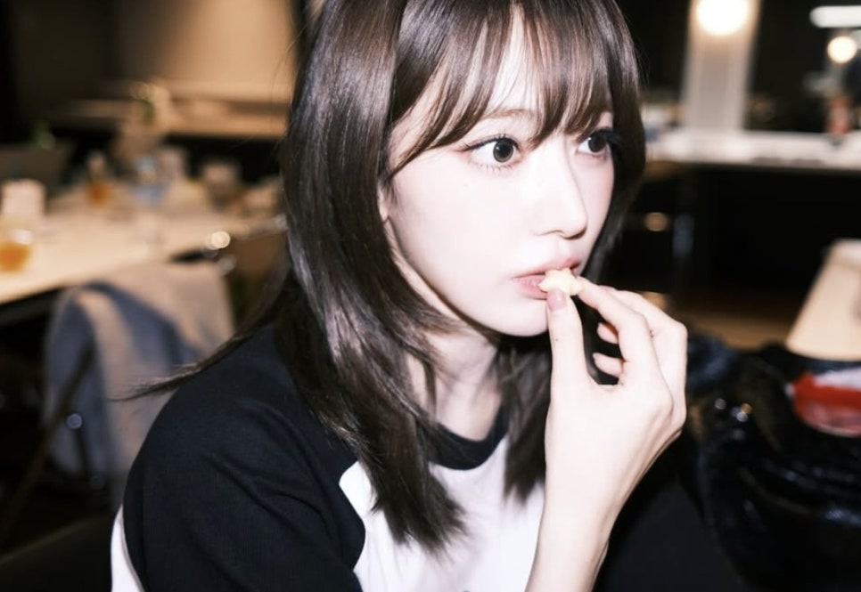 사쿠라는 사랑스러움과 청순함이 공존하는 중단발을 선보였는데요. 가볍게 내려오는 시스루뱅은 이마를 은은하게 덮어주며 눈매를 강조하고, 전체적으로 볼륨이 들어간 레이어드 컷은 얼굴형을 작고 갸름하게 보이게 합니다.