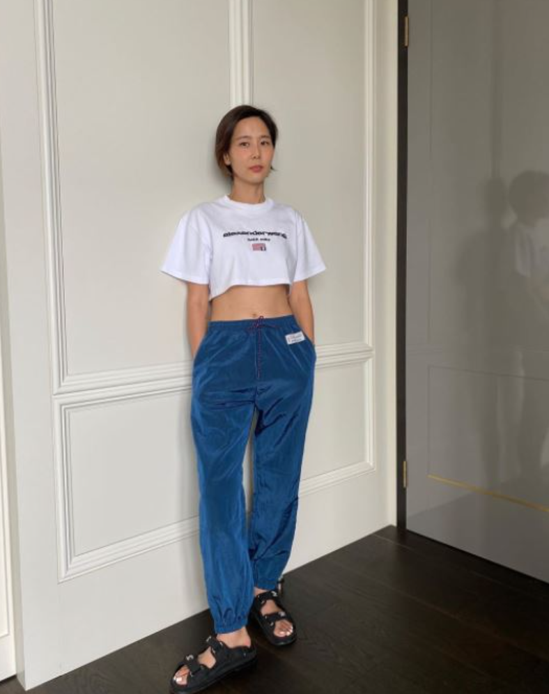 또한 원조 패셔니스타 김나영은 은은한 광택이 도는 나일론 소재의 조거 팬츠를 선택해 스포티함이 물씬 느껴지는 데일리 룩을 완성했다. 자칫 투박해보일 수 있는 스니커즈가 아닌 샌들로 마무리한 점도 눈여겨볼 것.