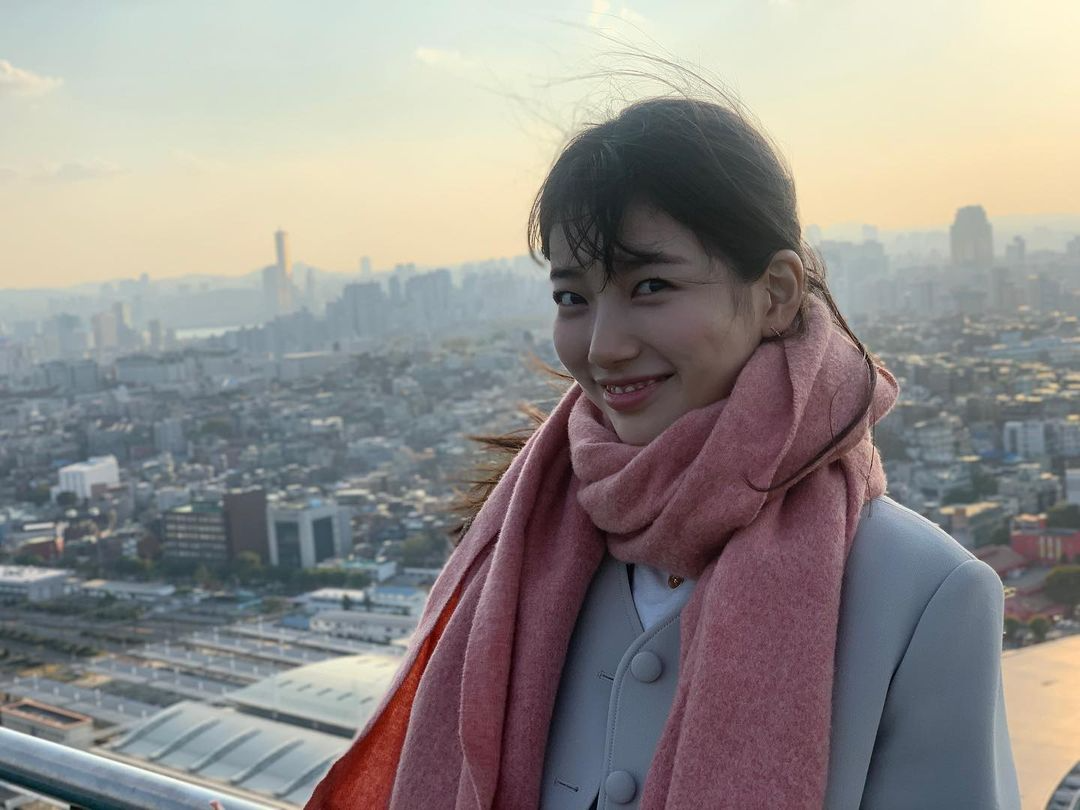 청순 그 자체인 수지는 모노 톤모노톤 재킷에 핑크 멜란지 컬러 머플러를 착용해 스타일 포인트를 주었다. 그레이나 회색 등 모노톤 아우터가 많은 겨울엔 수지처럼 컬러감이 있는 머플러를 사용해 보는 것도 좋을 듯!