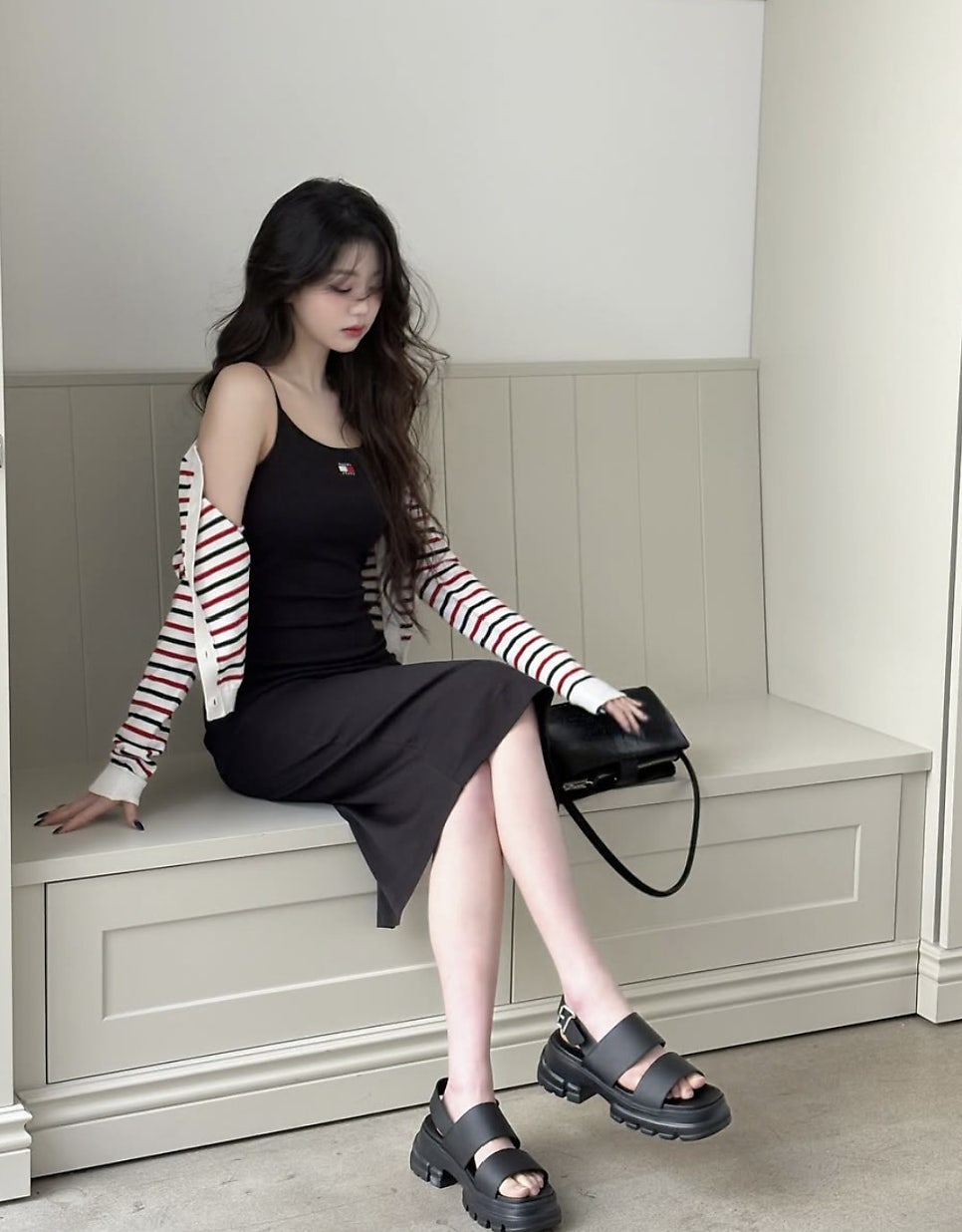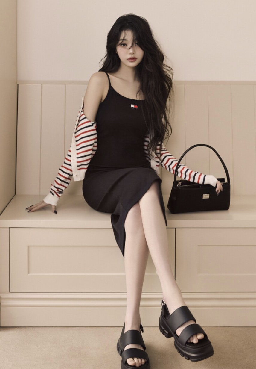 그녀가 착용한 아이템은 타미 진스의 ‘스트래피 립 미디 원피스’입니다. 간결하지만 탄탄한 실루엣, 그리고 그녀 특유의 청순하고 도회적인 분위기와 완벽하게 어우러지는 아이템이죠.
