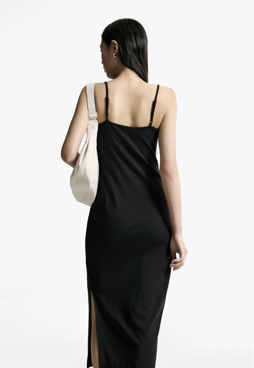 이 단정하면서도 과감한 이 원피스는 어깨의 슬림 스트랩과 바디에 핏되는 라인감이 특징인데요, 이너 없이도 단독으로 충분히 완성도 높은 스타일을 연출할 수 있어 특히 데일리룩이나 데이트룩으로도 안성맞춤입니다. 에디터가 여자 여름 원피스 하나만 추천하라면 단연코 장원영이 입은 이 타미진스 원피스를 추천하고 싶을 정도 ✨