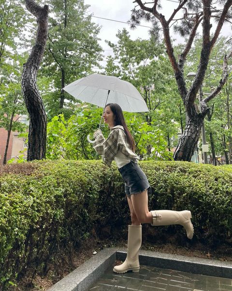잘 고른 레인부츠 하나면 꾸민 듯 안꾸민 듯 멋스러운 데일리 룩을 완성할 수 있다. 우주소녀 보나는 짧은 데님 쇼츠에 체크 셔츠 그리고 무릎 아래까지 올라오는 베이지 컬러 레인부츠를 활용했다. 이처럼 짧은 쇼츠에 롱부츠를 매치하면 스타일리시함은 물론 한층 다리가 길어보이는 효과를 느껴 볼 수 있다.