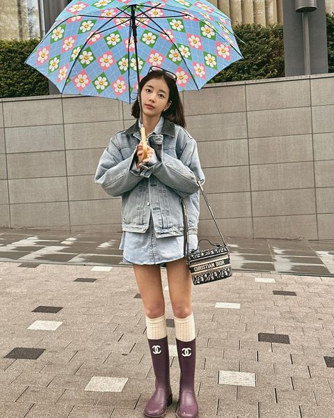 혹 롱부츠와 숏부츠 사이에서 고민하고 있다면 무릎 한 뼌 아래 정도 길이감을 지닌 미디 부츠를 선택하는 것도 좋다. 기은세는 청청 룩에 퍼플 컬러 레인 부츠 그리고 니삭스를 활용해 멋스러운 장마 룩을 연출했다. 평소 작은 키가 컴플렉스라면 기은세처럼 레인 부츠와 니삭스를 함께 레이어링 해 볼 것. 비율이 좋아 보이는 효과를 느껴 볼 수 있다.