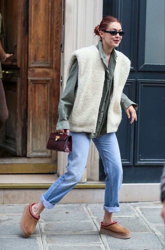 가볍과 내구성이 뛰어난 아웃솔을 갖추고 있어 실내나 실외 어느 곳에서나 신을 수 있다. 평소 어그 부츠를 애용하는 지지하디드는 플리스 조끼에 데님 팬츠와 함께 타스만을 매치해 심플한 룩을 선보였다. 수영처럼 타스만 슬리퍼를 실내 보온용품으로 사용해 보는 것도 추천.