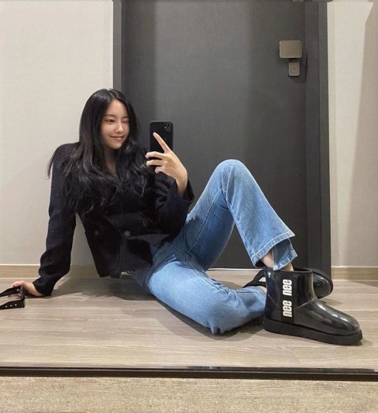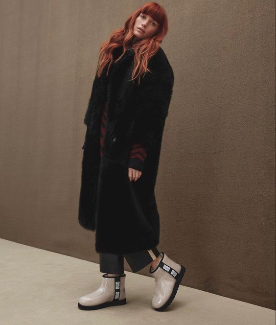 물에 약한 어그 부츠의 단점을 완전히 보완했다. 어퍼 겉면이 PVC 소재로 제작되어 눈이 많이 오는 겨울철에 신기 제격인 어그 부츠. 내부는 울 안감으로 구성되 영하 20'C 추위까지는 거뜬하게 견딜 수 있는 실용적인 아이템. 굳이 눈이나 비가 오지 않는 날에도 효민처럼 미니멀한 무드의 재킷과 팬츠와 함께 매치하면 유니크하면서도 트렌디한 룩을 완성할 수 있다.