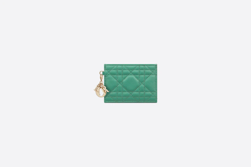 레이디 디올 카드지갑은 내구성이 좋고 튼튼한 페이턴트 송아지 가죽 소재와 고급스러운 양가죽 두 가지 소재로 제작되며, 탈착식으로 제작된 D.I.O.R 참이 스타일링 포인트. (디올 오피셜 페이지)