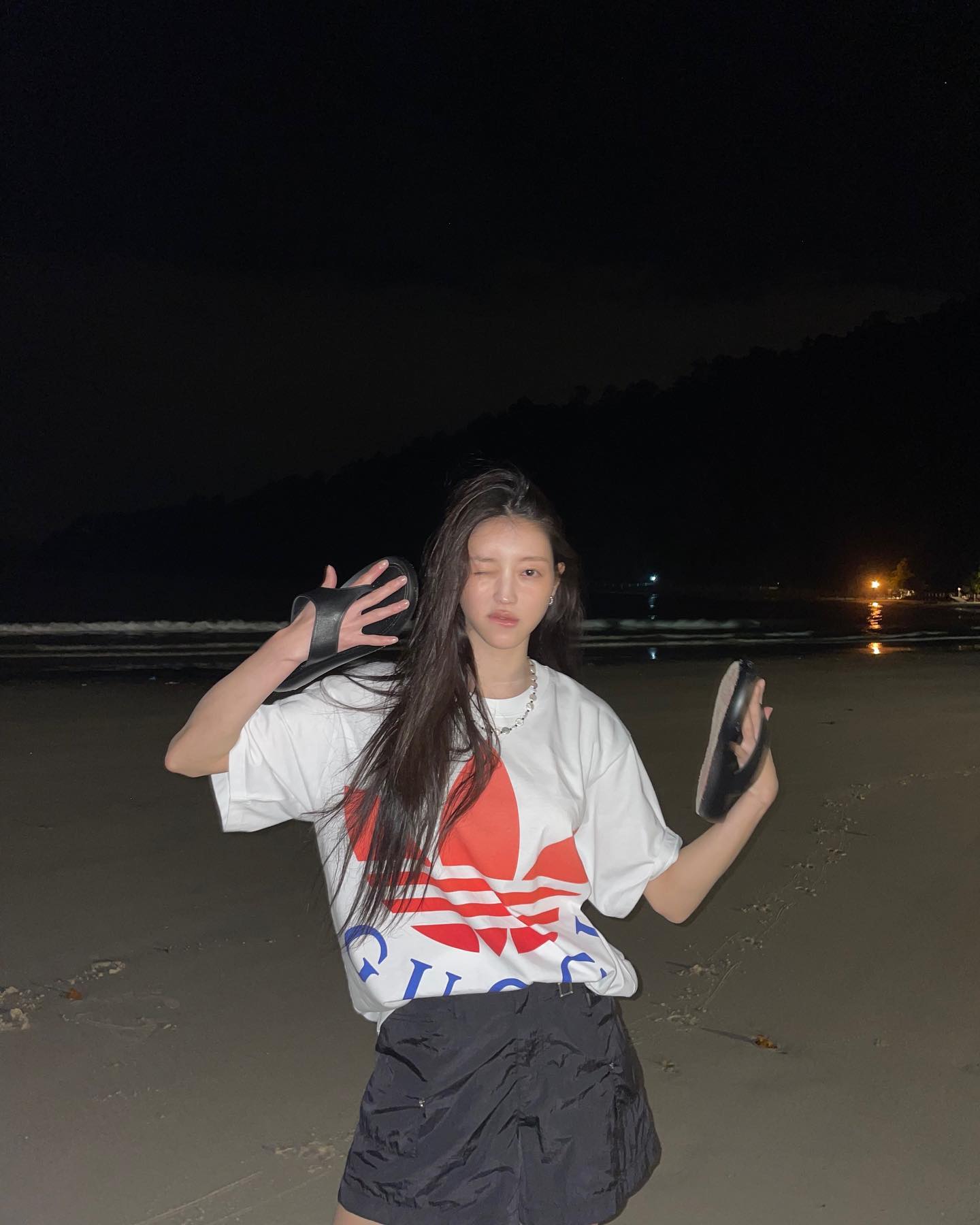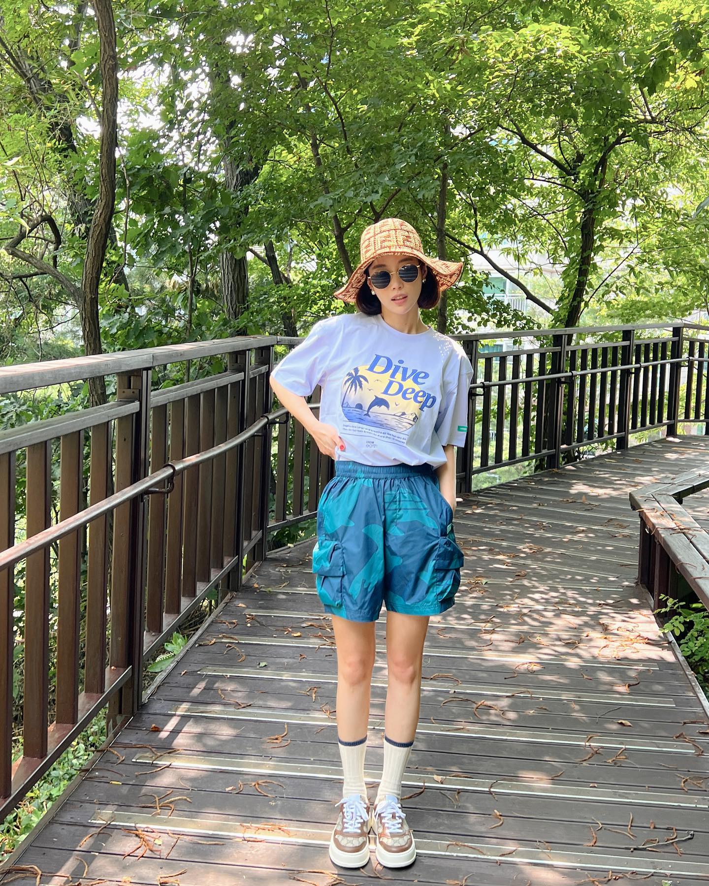 Y2K 스타일이 대세로 떠오르면서 '그때 그 시절'이 떠오르는 빈티지 티셔츠의 인기도 급상승했다. 기은세는 빈티지한 이미지와 문구가 새겨진 티셔츠에 쇼츠와 양말을 더했다. 그녀처럼 티셔츠의 그래픽에 사용된 컬러와 비슷한 하의나 액세서리를 활용하면 전체적인 룩에 통일감을 줄 수 있으며 스타일의 완성도를 높일 수 있다.