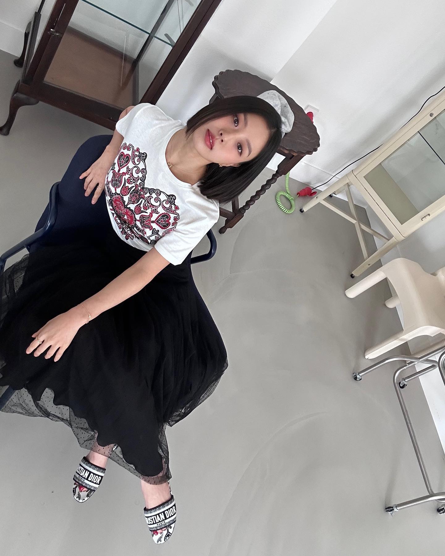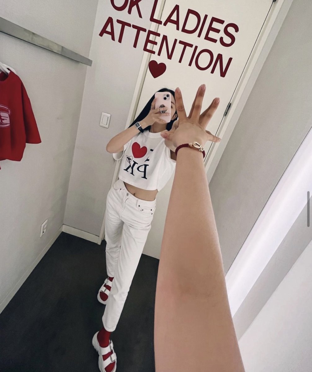 효민 역시 I LOVE PK가 적힌 화이트 크롭티에 화이트 팬츠 그리고 플랫폼 샌들을 매치했다. 이 때 양말은 레드 컬러로 티셔츠의 하트 컬러와 색을 맞춘 센스도 눈여겨 볼 것. 크롭 티셔츠를 활용할 때 효민처럼 원컬러로 톤을 맞추면 멋스러우면서도 안정감 있는 티셔츠 스타일링을 완성할 수 있다는 점도 기억해 두자.