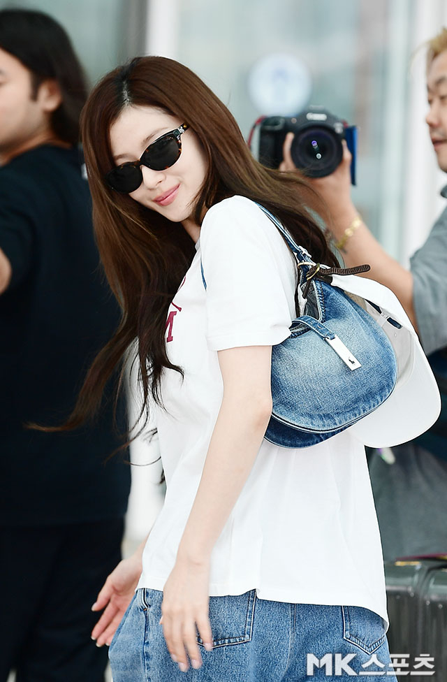사나는 누구나 하나쯤 있을 법한 패션 아이템들로 공항패션을 완성했는데요. 심플한 프린팅이 새겨진 러프한 화이트 티셔츠에 오버 핏 데님팬츠 그리고 운동화를 매치했습니다.