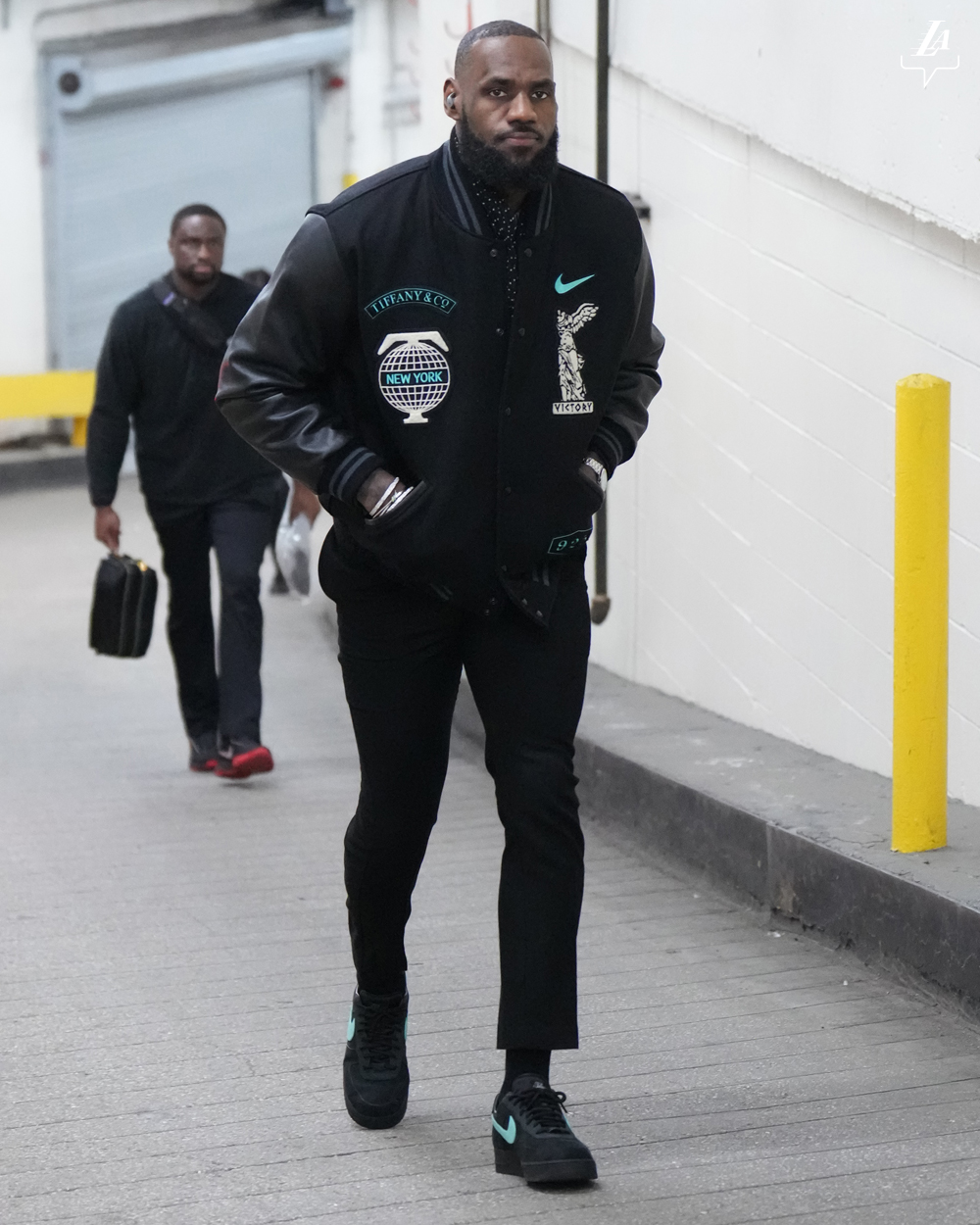 LA 레이커스는 공식 SNS 채널을 통해 뉴욕 매디슨 스퀘어 가든에서 포착한 르브론 제임스의 모습을 공개했습니다. 이날 르브론은 블랙 어퍼에 ‘티파니 블루’ 스우시가 적용된 협업 에어 포스 1 과 바시키 자켓을 착용했습니다.