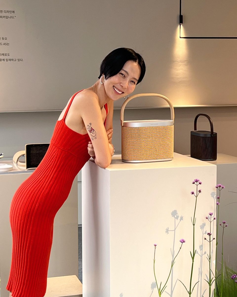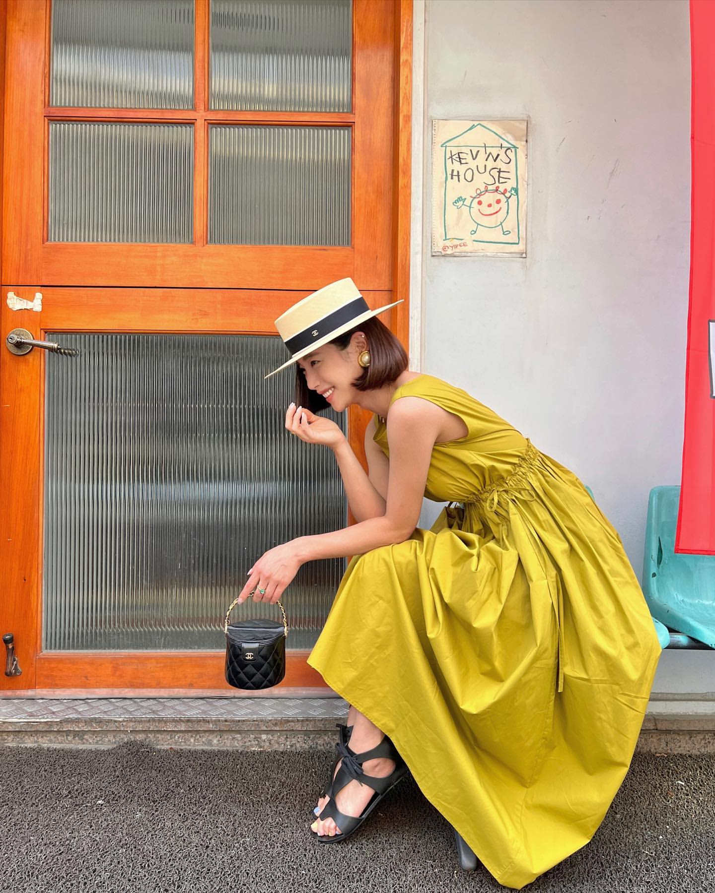 휴양지에서 입기 좋은 롱 원피스를 더욱 멋스럽게 소화하고 싶다면 기은세처럼 클래식한 무드의 라피아 햇을 더해 볼 것. 기은세는 화사한 옐로 컬러 롱 원피스에 보터햇과 피셔맨 샌들을 매치해 힙한 바캉스룩을 선보였다.